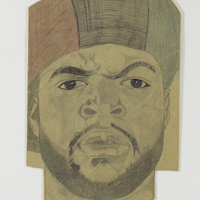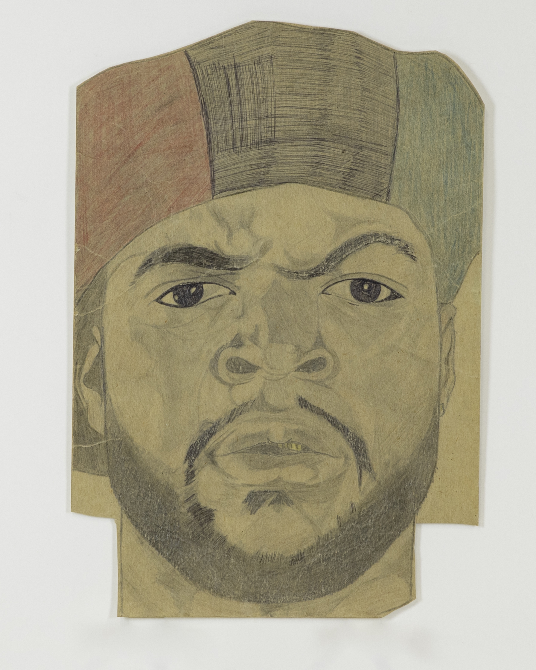 - Color portrait of Ice Cube in red, black and green striped hat.