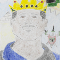 - Color portrait of a man wearing a crown, wearing a blue and black coat. Behind him are a pyramid, a pan-African flag, and three crossed swords behind a shield.