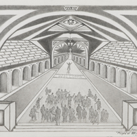 - Black and white image of a mob of people walking down a path toward a welcome sign and a person with outstretched arms.