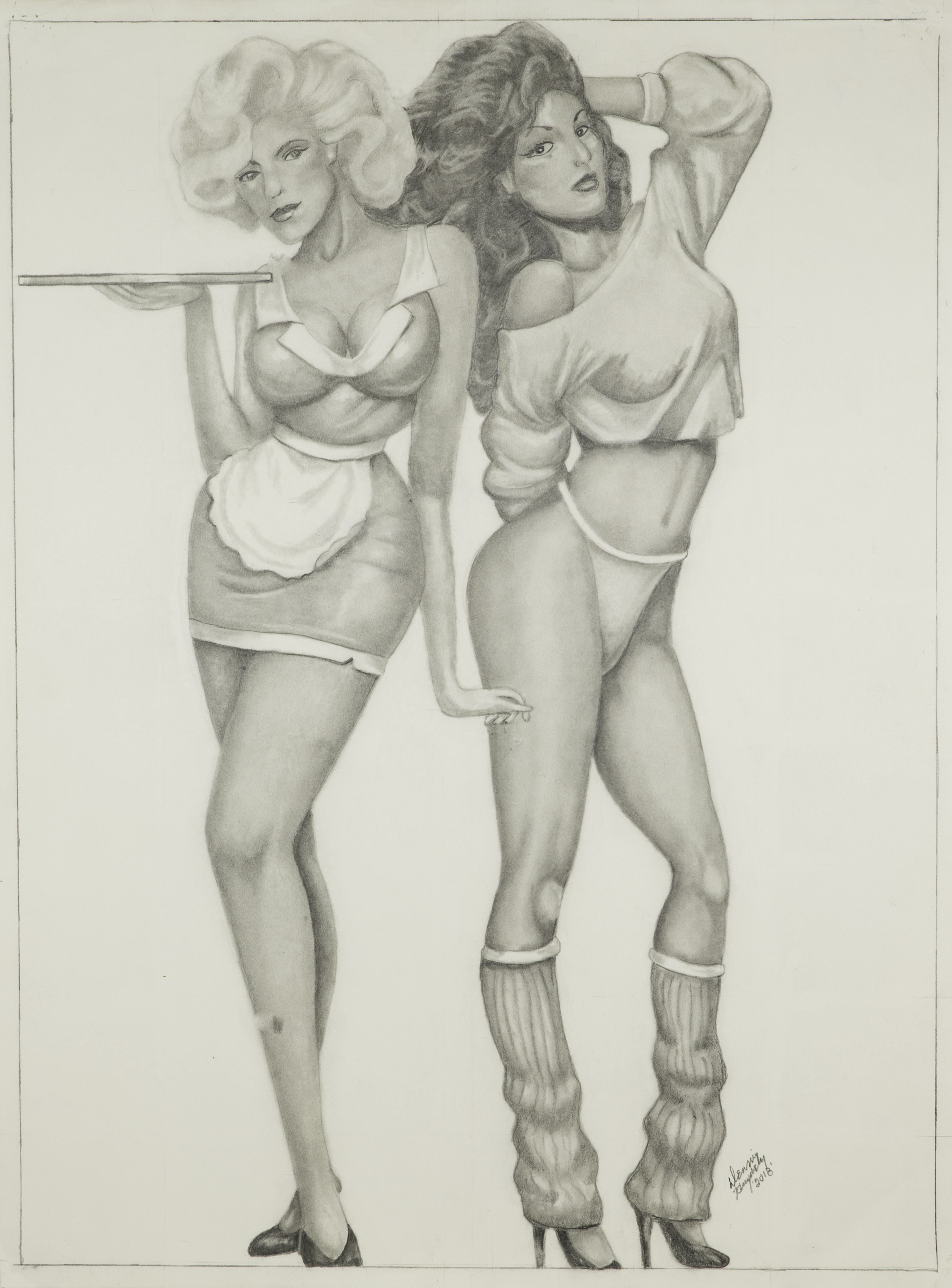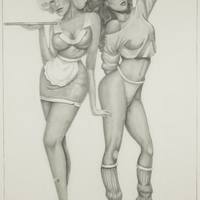 - Black and white portrait of two women, done in pin up style. One is dressed as a waiter and the other in a sweater and bikini bottom.
