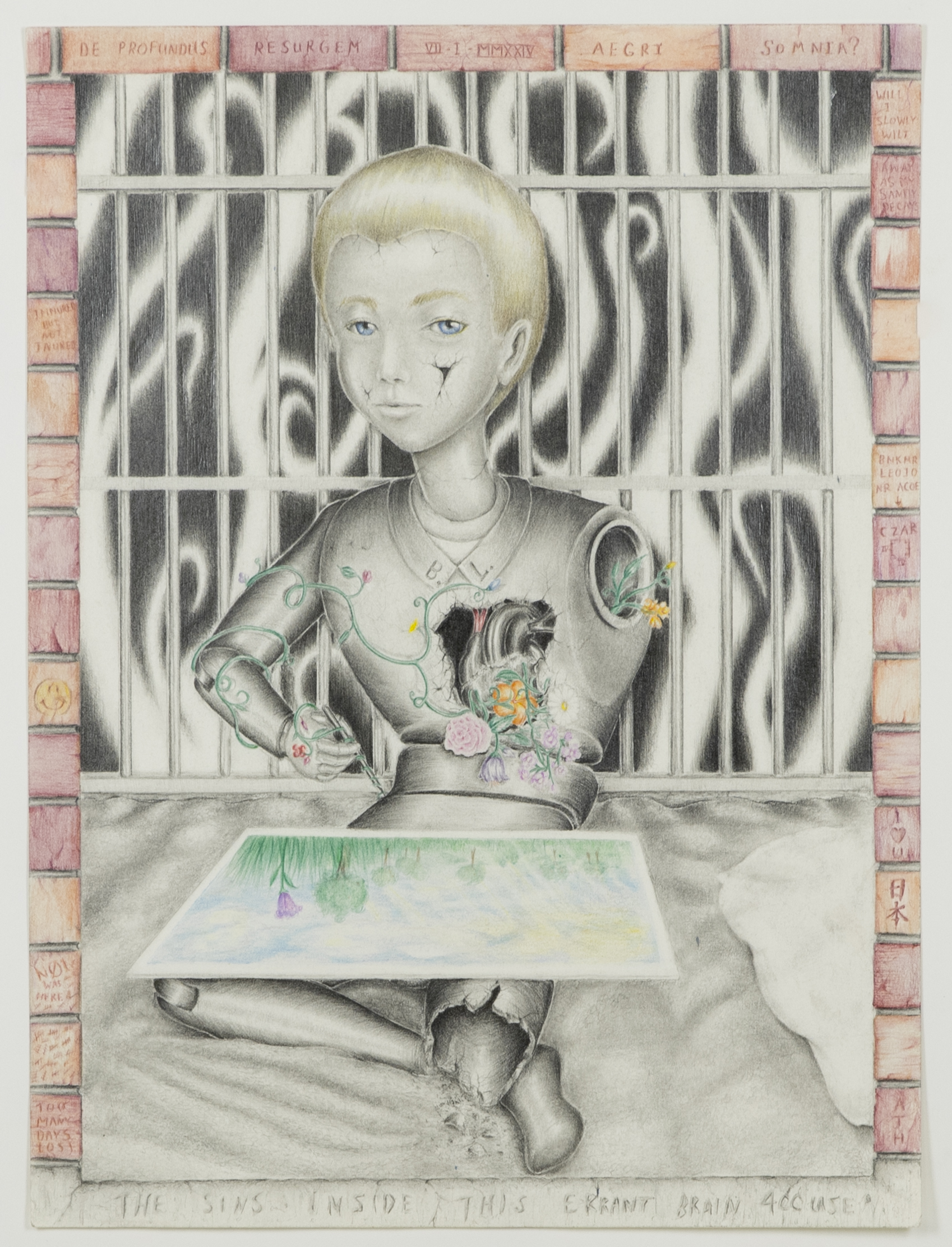 - Color image of a broken boy doll with flowers sprouting from the cracks in his body sitting in a cell. In the bricks that make up the frame there are words like 'The sinse inside this errant brain 4cc case'.