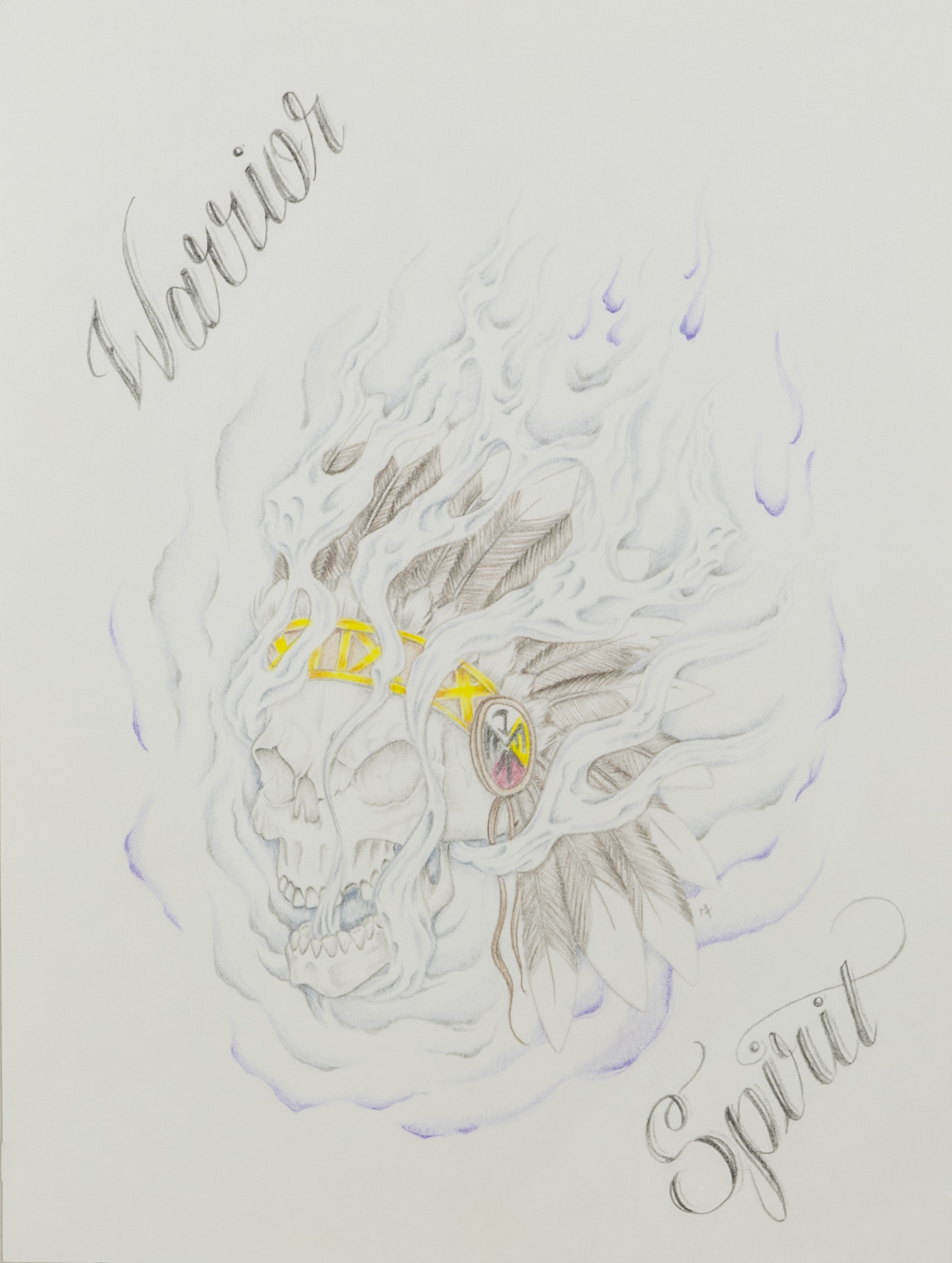 - Color image of a skull wearing a native american headdress with smoke coming out of its mouth and surrounding it. The skull is surrounded by the words "Warrior Spirit".