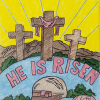 - Colored image of three crosses in a body of water, the middle one bearing a pink ribbon, and the words 'He is Risen' below them.