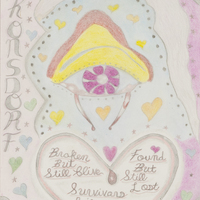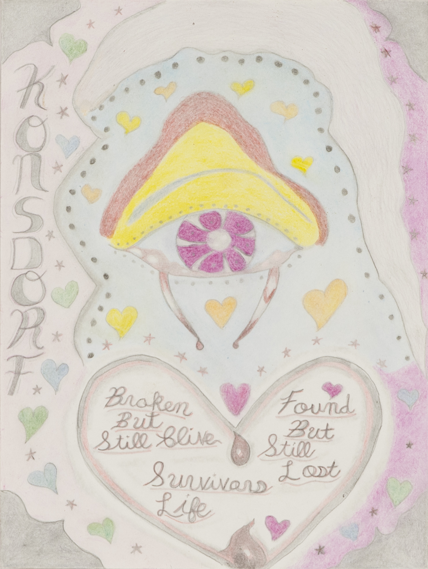 - Color image of an eye crying pink tears, with a flower as the iris. Below and next to the eye are the words 'Konsdorf', 'Broken but still alive', 'Found but still lost', and 'Survivors life'.