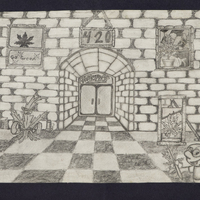 - Black and white image of a hallway full of marijuana paraphernalia, including a gnome holding a pot leaf in the corner.