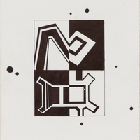- Black and white geometric design confined to a rectangle in the center of the piece, with a few black dots floating around it.