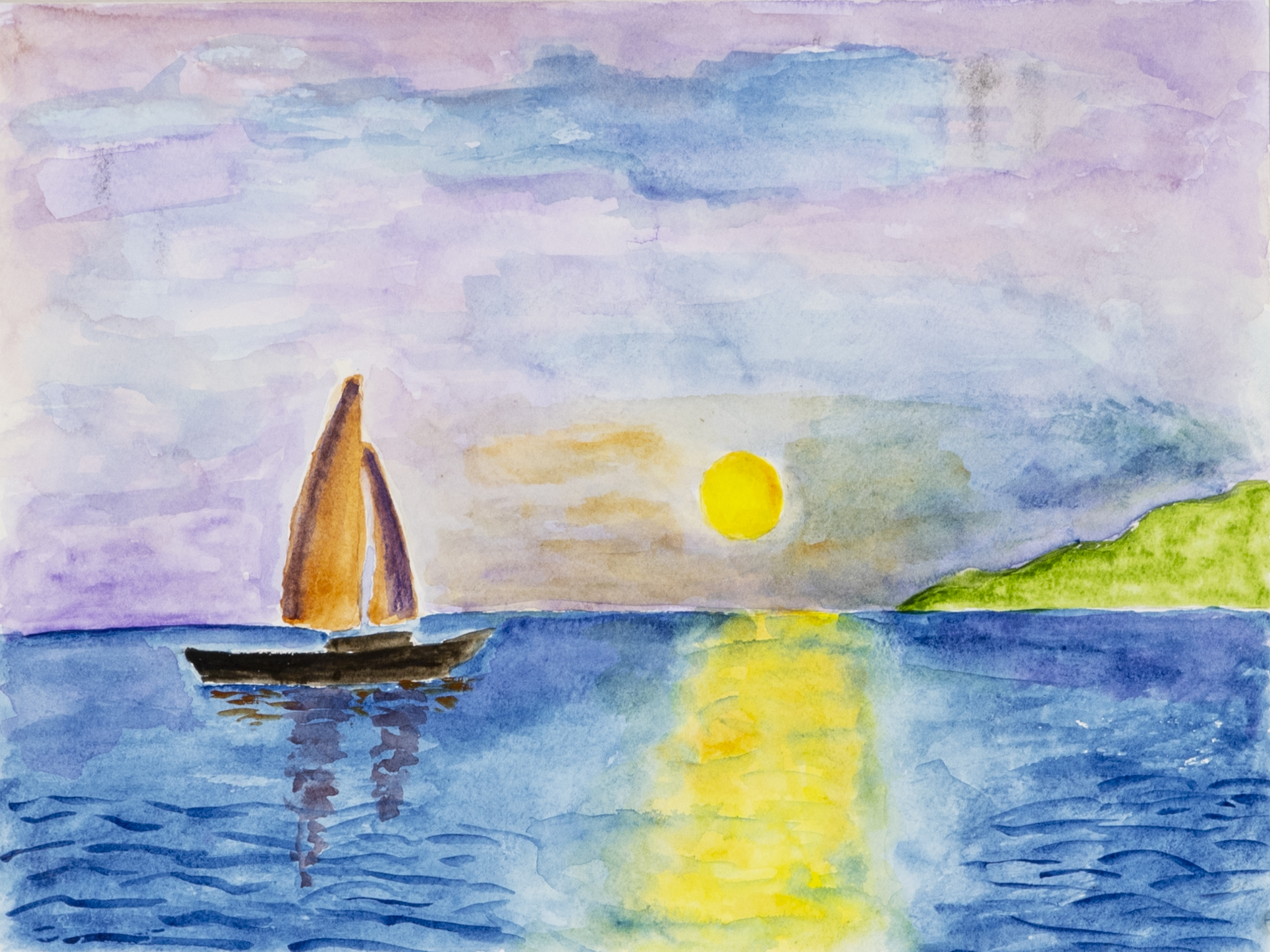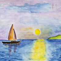 - Color image of a boat with orange and purple sails on a body of water, with a sliver of green land in the background. In the sky is a setting sun.