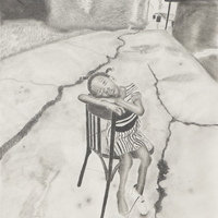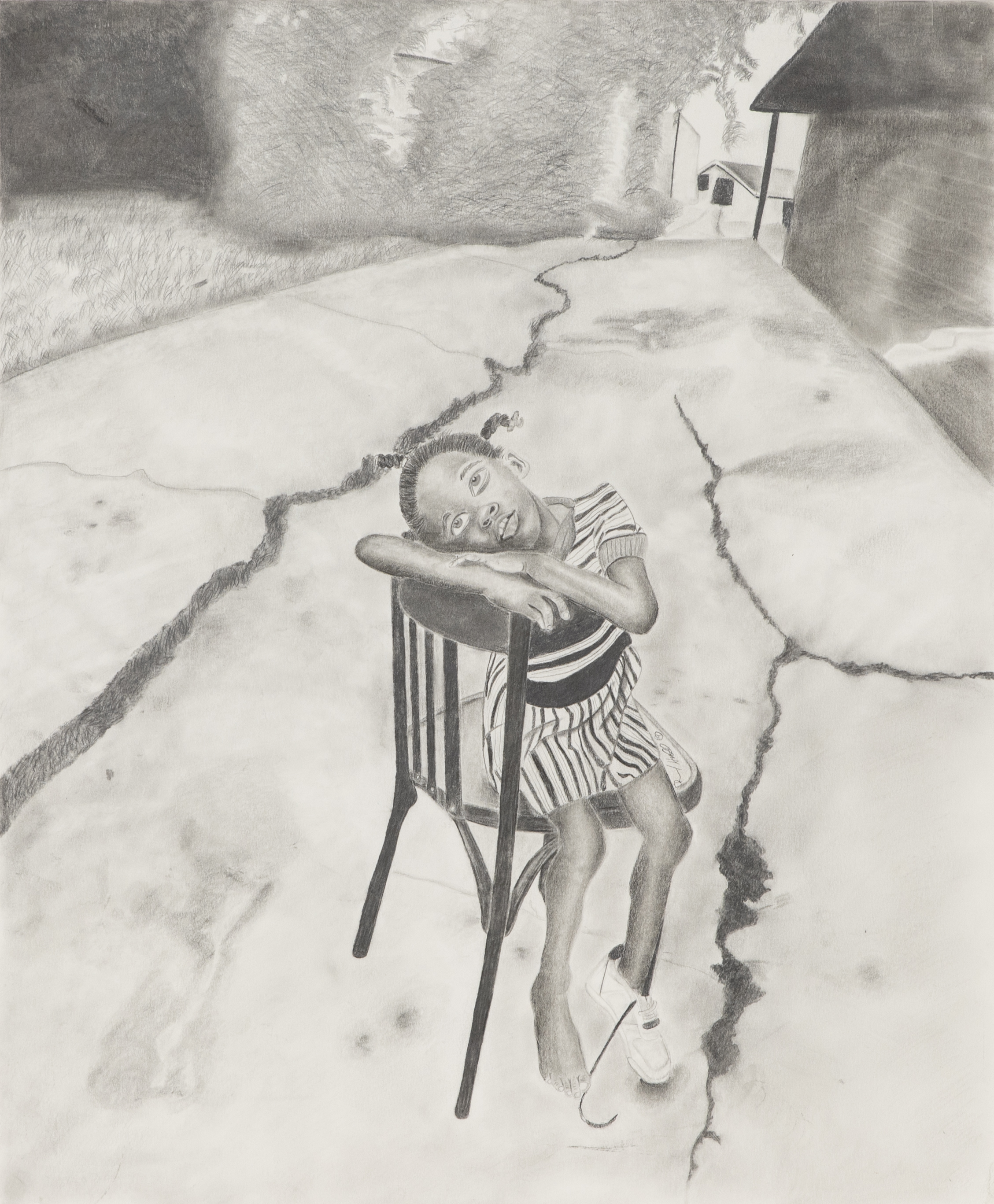 - Black and white image of a girl sitting on a chair in the middle of a cracked road.