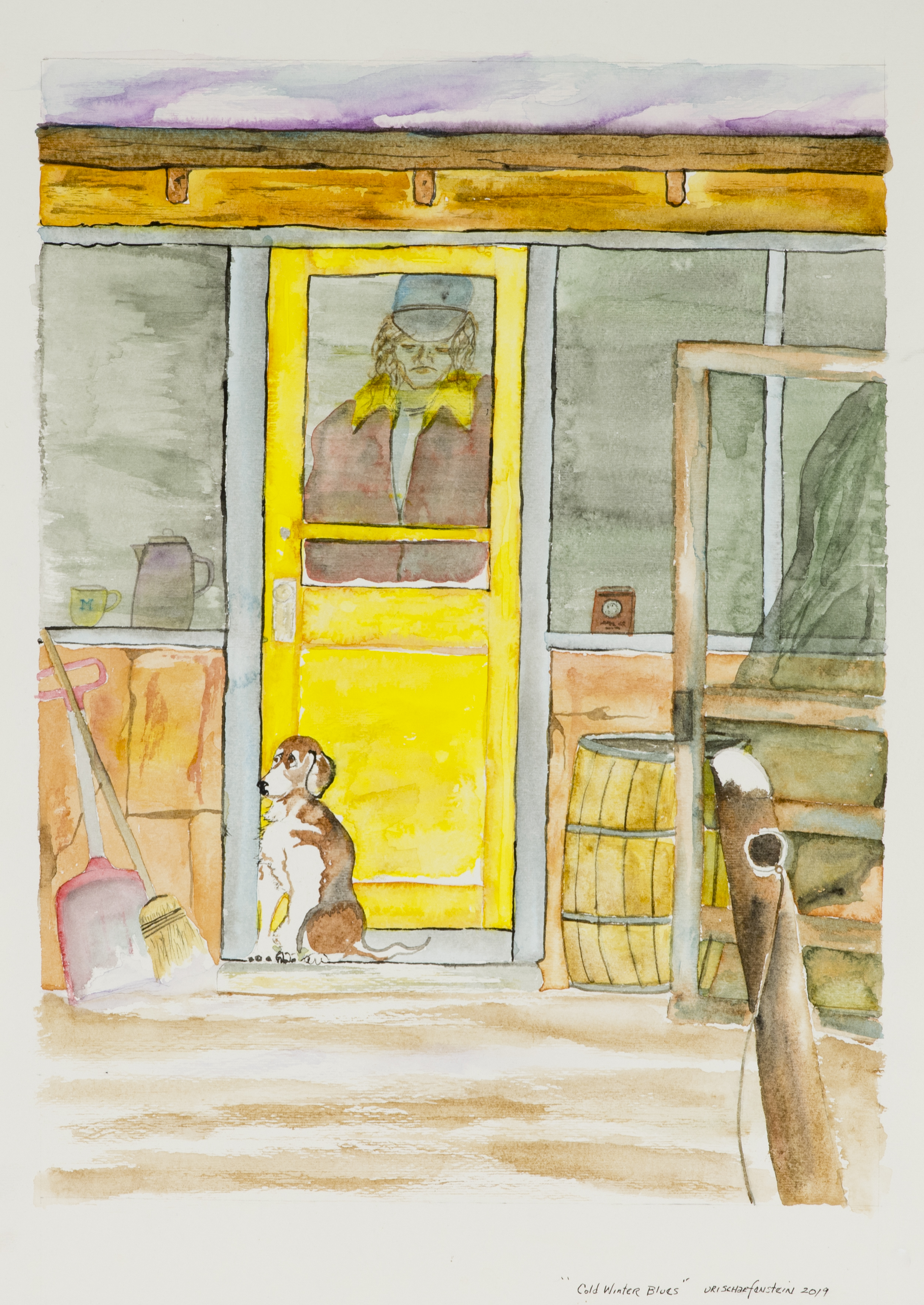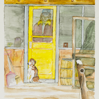 - Color image of a man in a hat standing behind a closed yellow door, with a dog sitting outside/under the window.