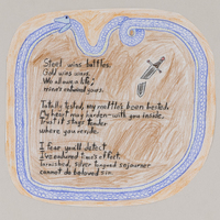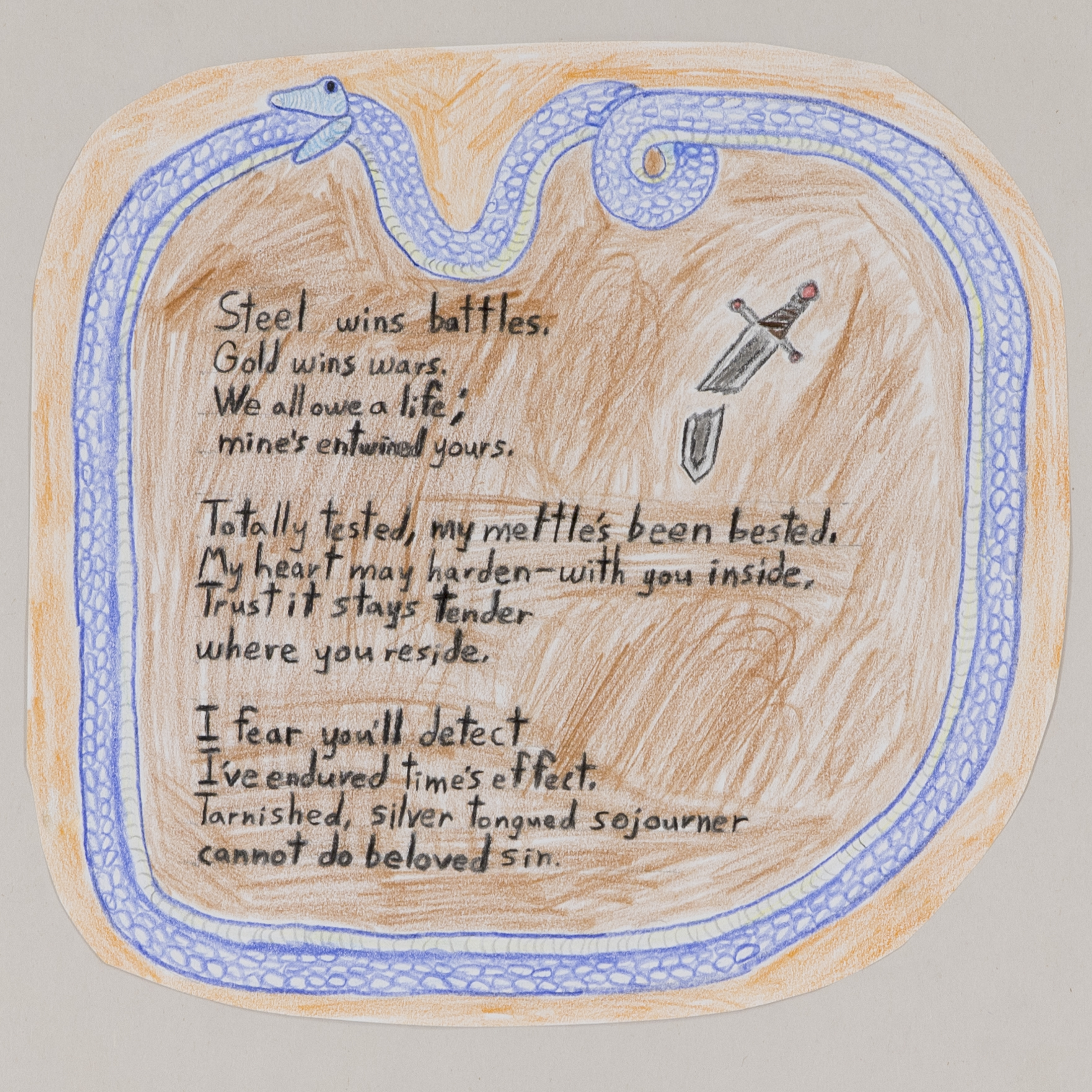 - Color image of a blue oroboros surrounding a poem and a broken sword. The poem says "steel wins battles, gold wins wars..."