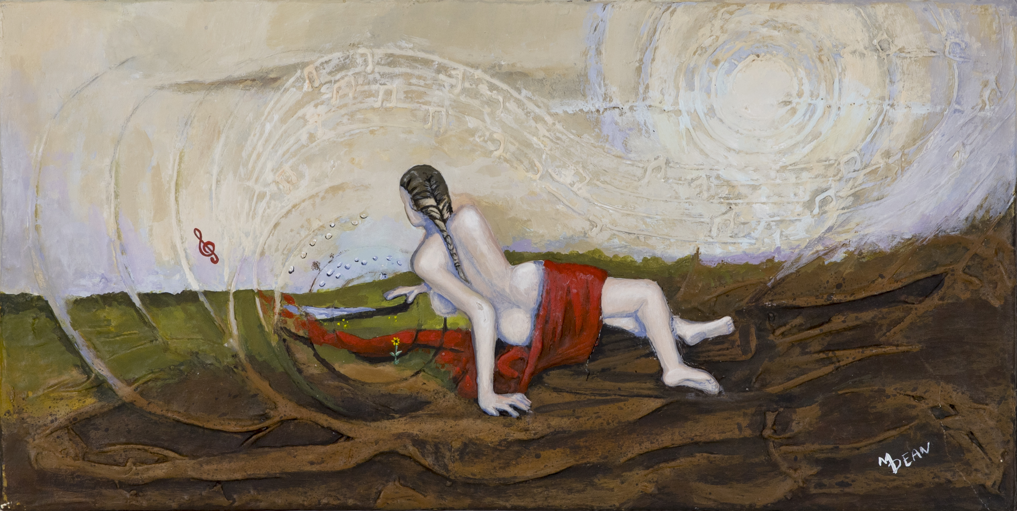 - Color image of a naked woman wraped loosely in a red strip of fabric looking away from the viewer. She is surrounded by sheet music swirling like the wind.