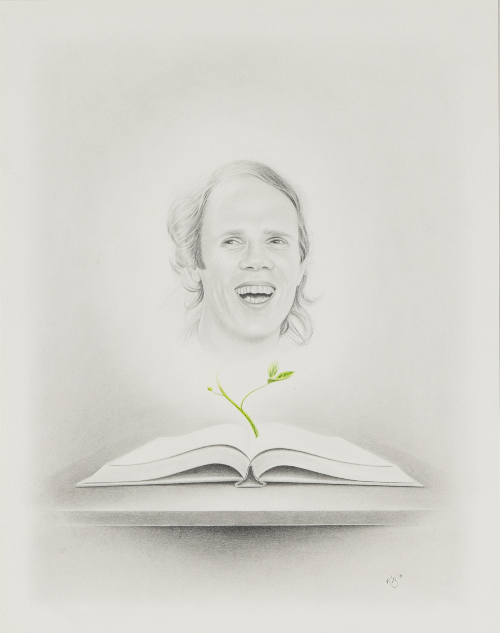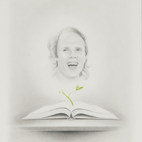 - Black and white image of Buzz Alexander's face floating above an open book, with a green plant sprouting out of the spine.