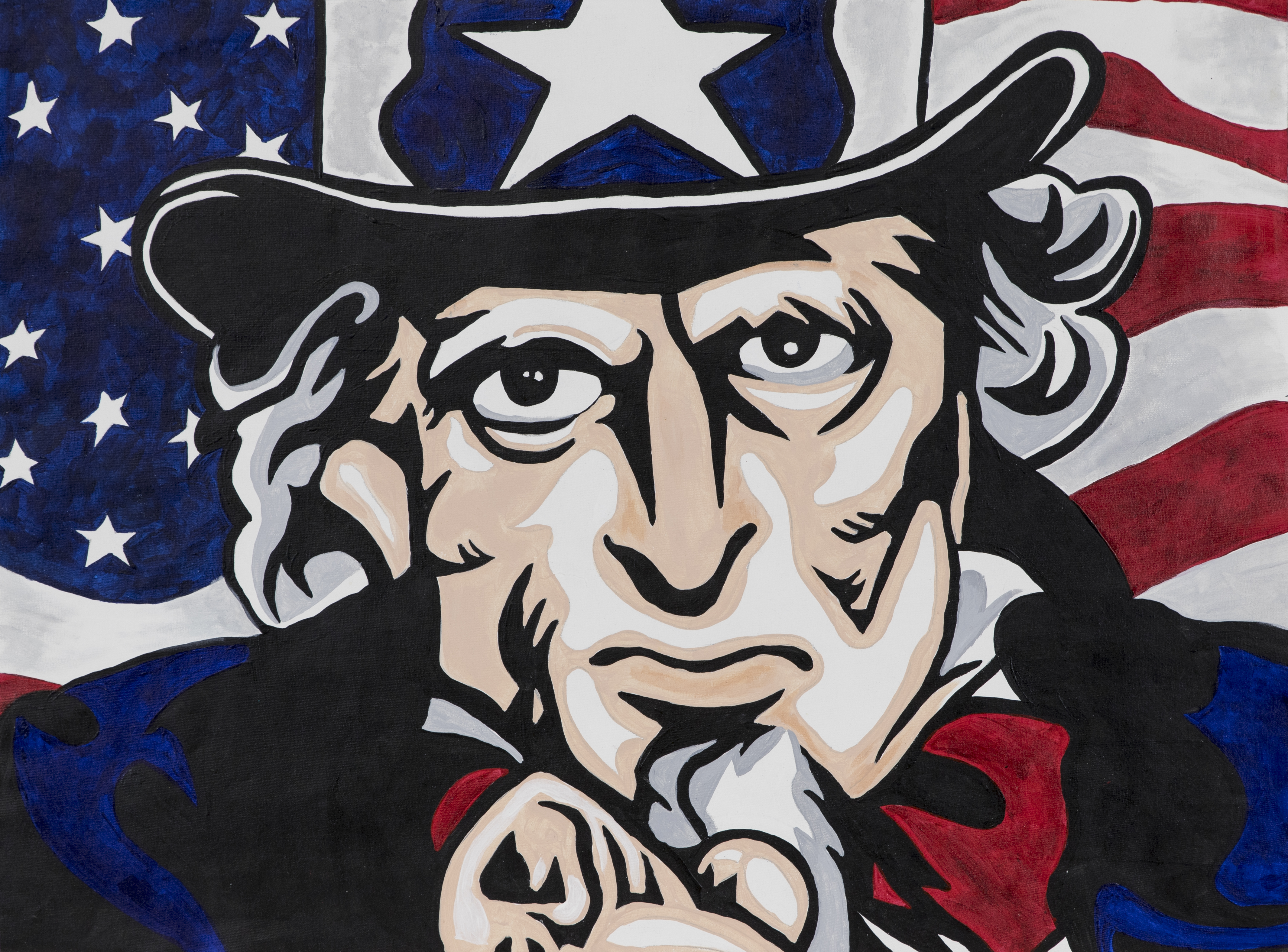 - Color image of Uncle Sam in front of an american flag.