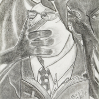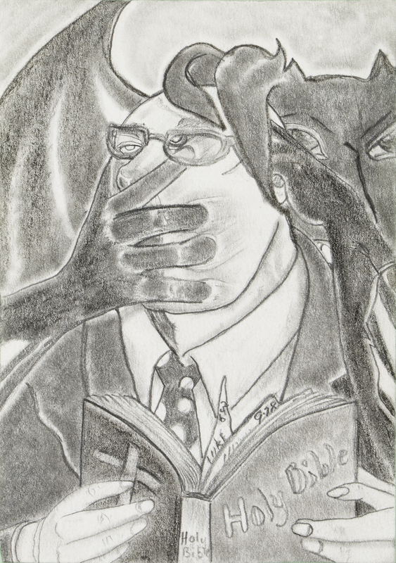 - Black and White image, man wearing glasses and holding a bible with a devil covering the mans mouth with his hand