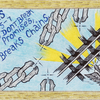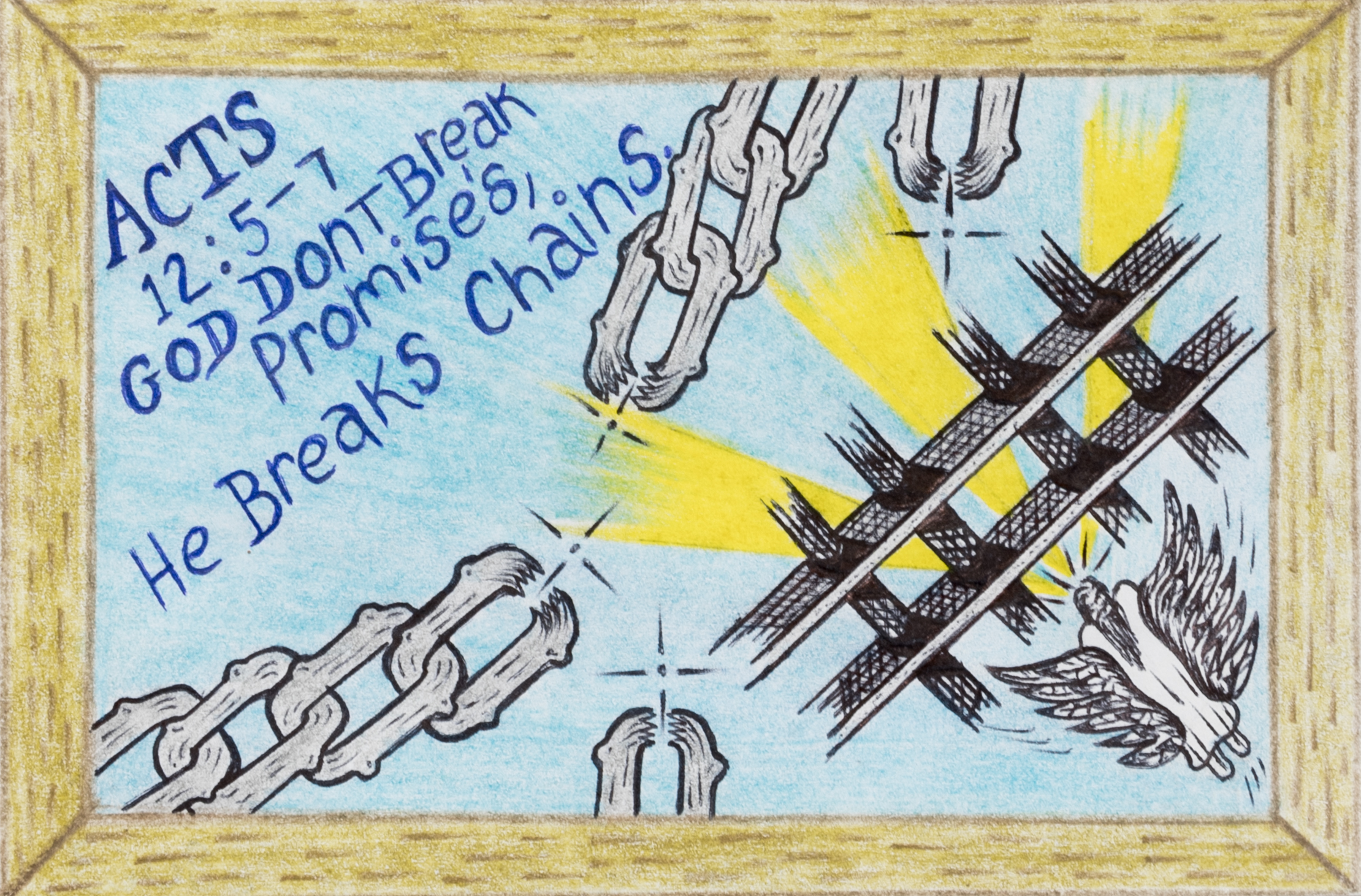 - Color image, broken chainss and cell bars on a brigh blue background, angel in the corner, words 'ACTS 12:5-7 GOD DONT BREAK Promises, He Breaks Chains' in the top corner, brown border