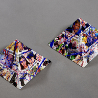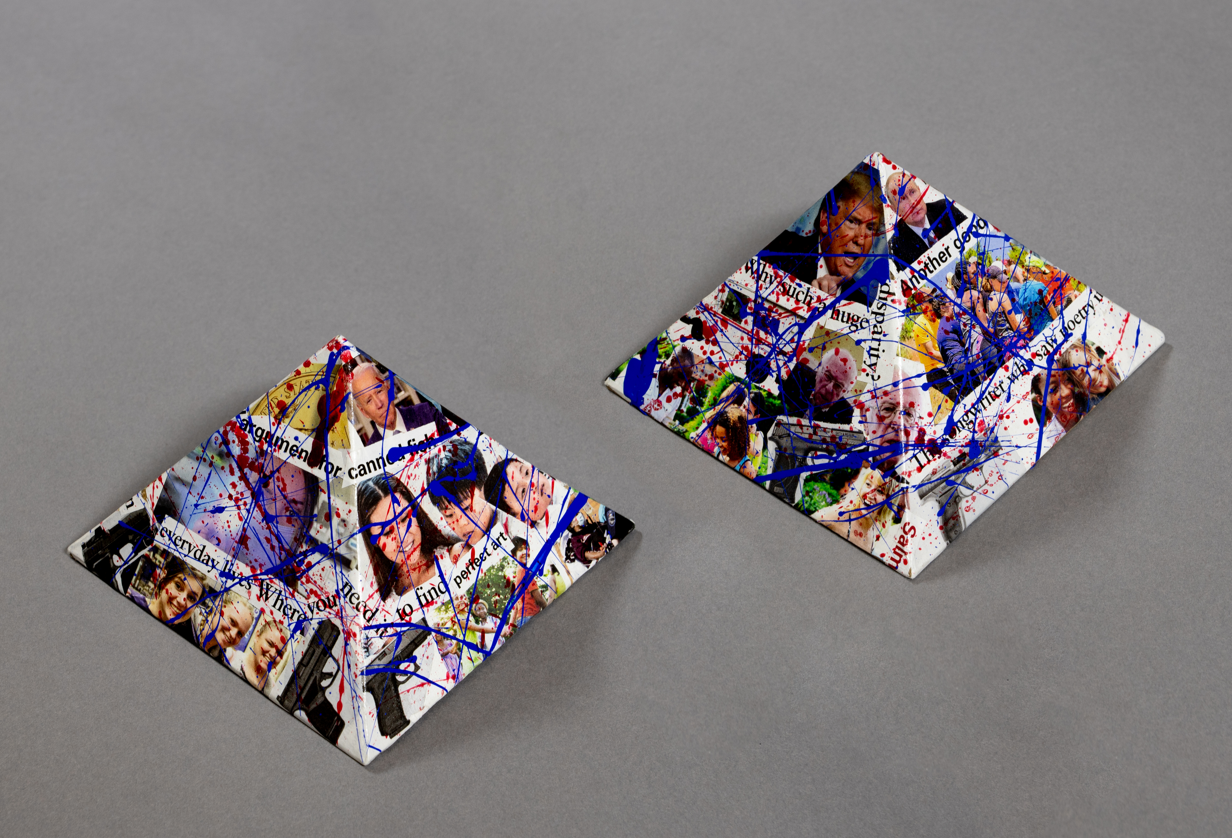 - Pyramid with sides decoragted with collage of words and images with political relevancy (ex/ trump yelling, the word 'Conspiracy?'), covered in blue splatter paint
