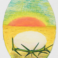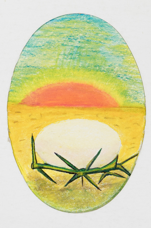 - Color image, sunset on sandy. landscape behind an egg on a nest of thorns