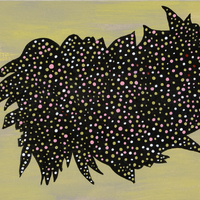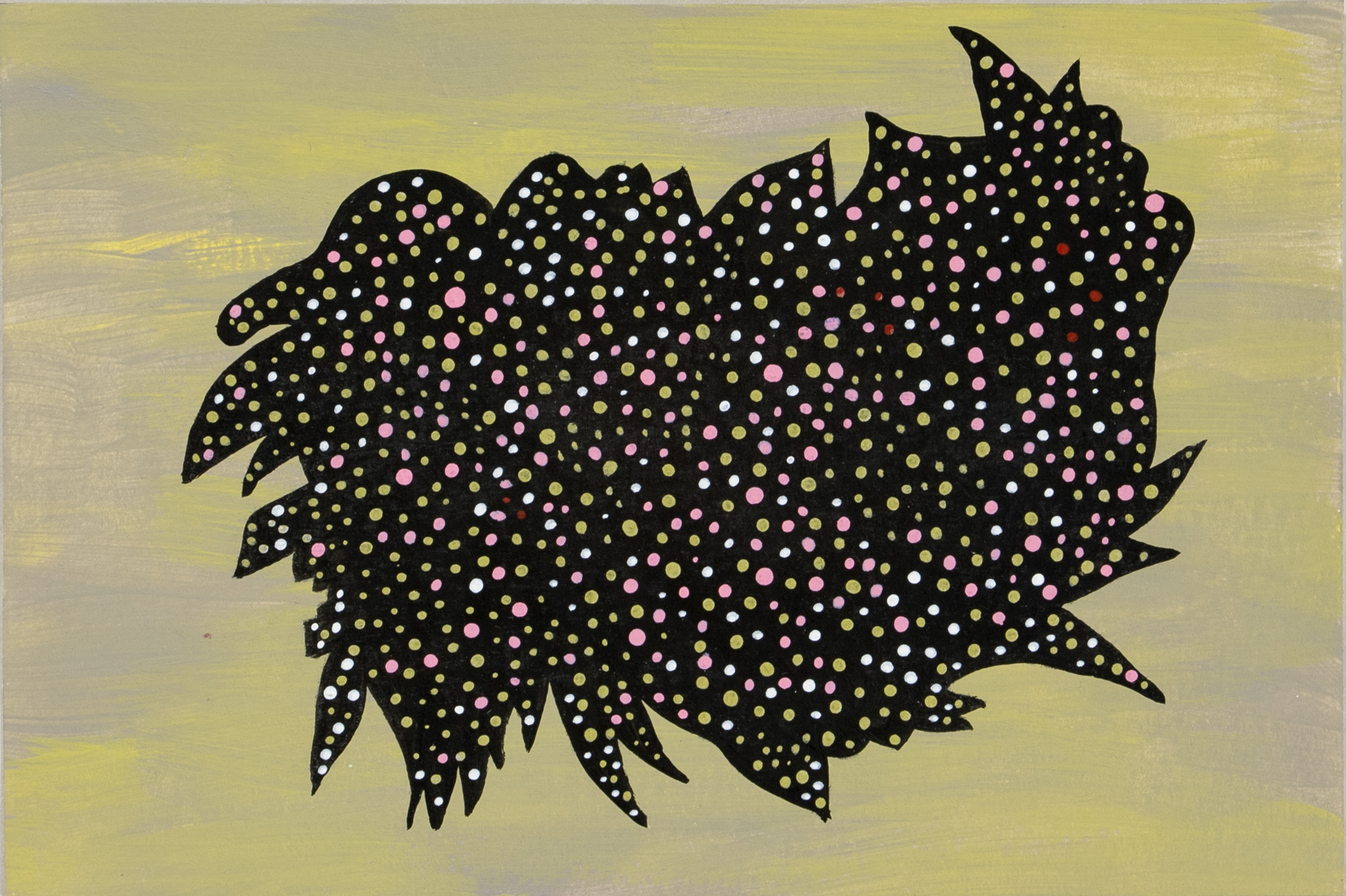 - Color image, large black shape with jagged edges covered in bright dots on a brown background