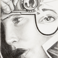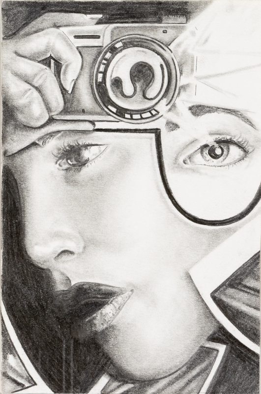 - Black and White image, woman with half of her face in frame holding a camera projecting the image of an eye on the side of her face