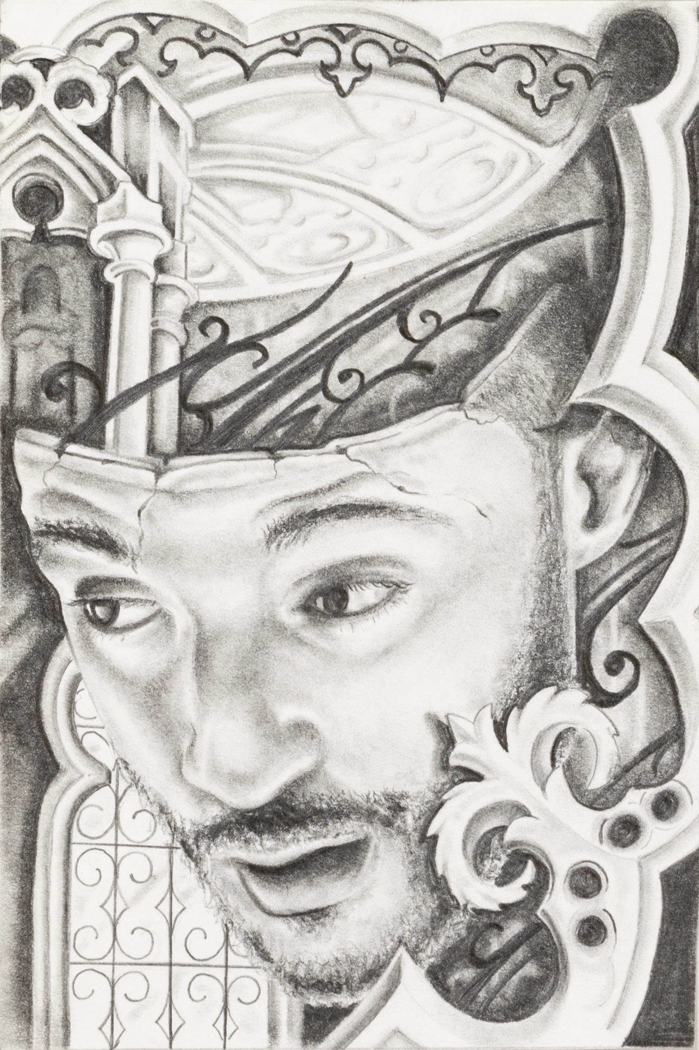 - Black and White image, the face of a man with filagree coming out of the back of his face in front of windows and spires