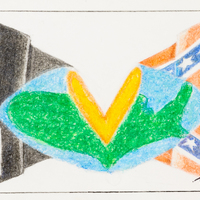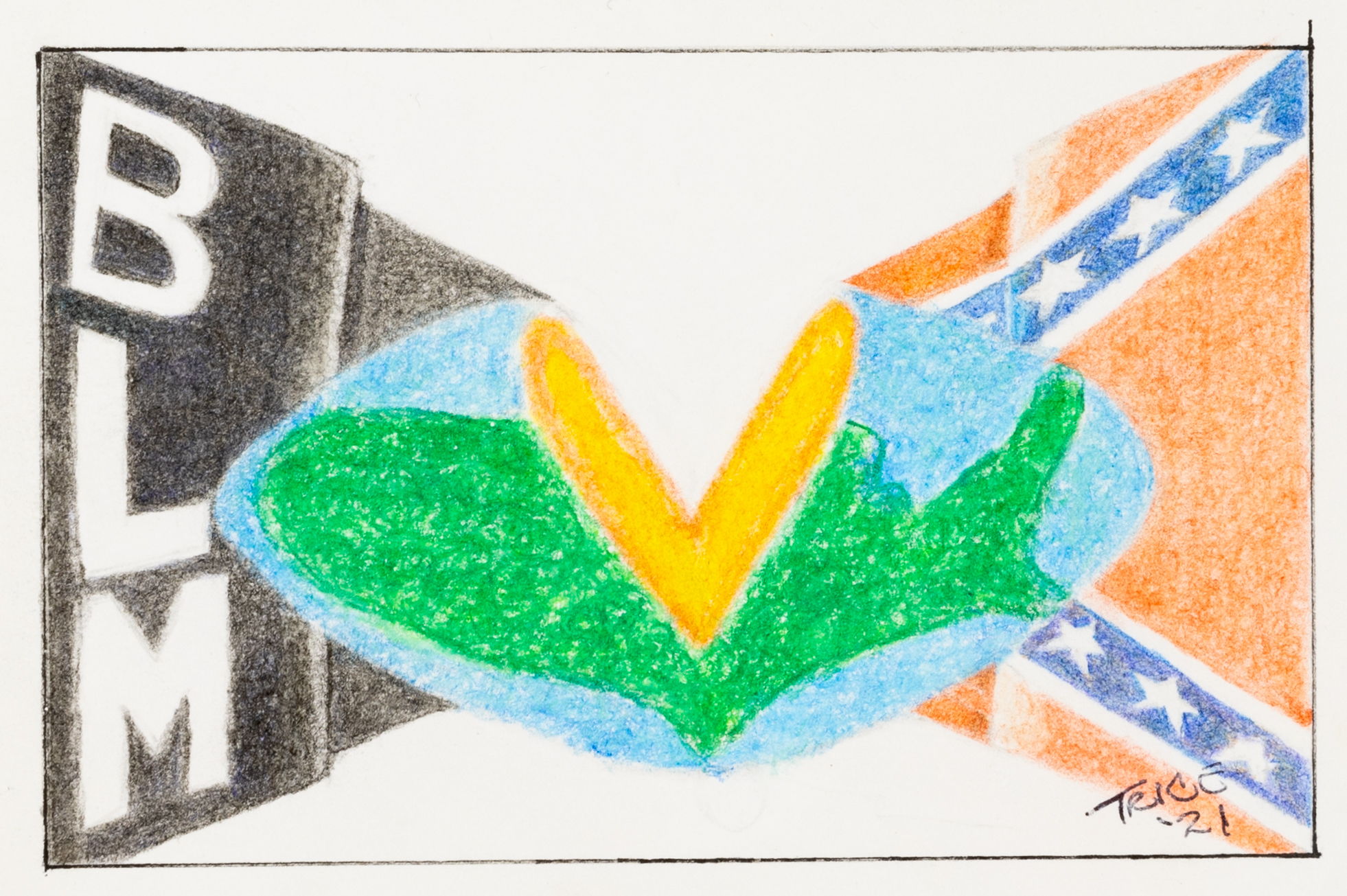 - Color image, the world splitting in half flanked by a BLM flag and a confederate flag