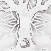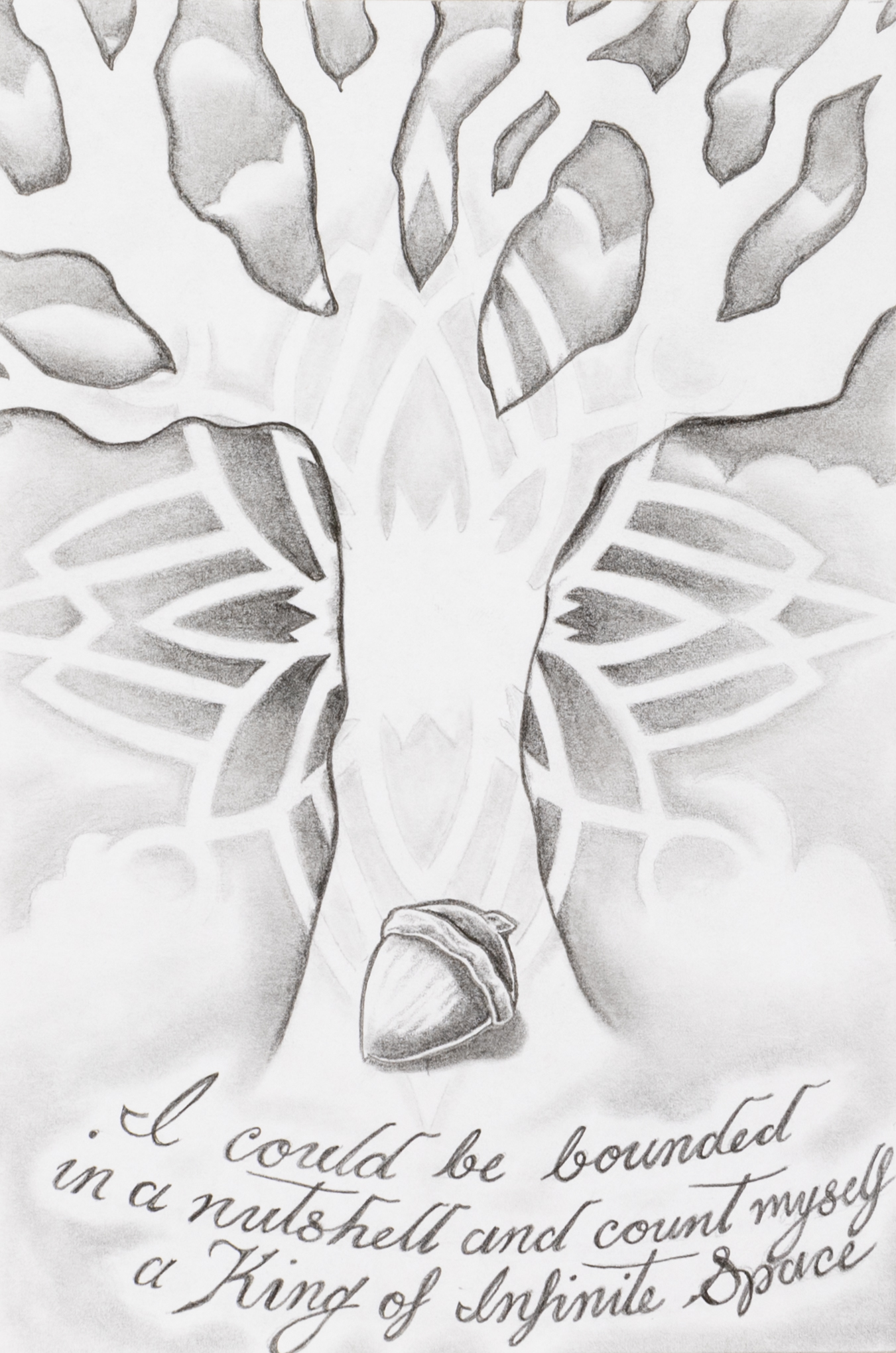 - Black and White image, a mandala behind the outline of a tree with an acorn at its base with some text below that, the text starts with the line 'I could be bounded'
