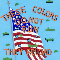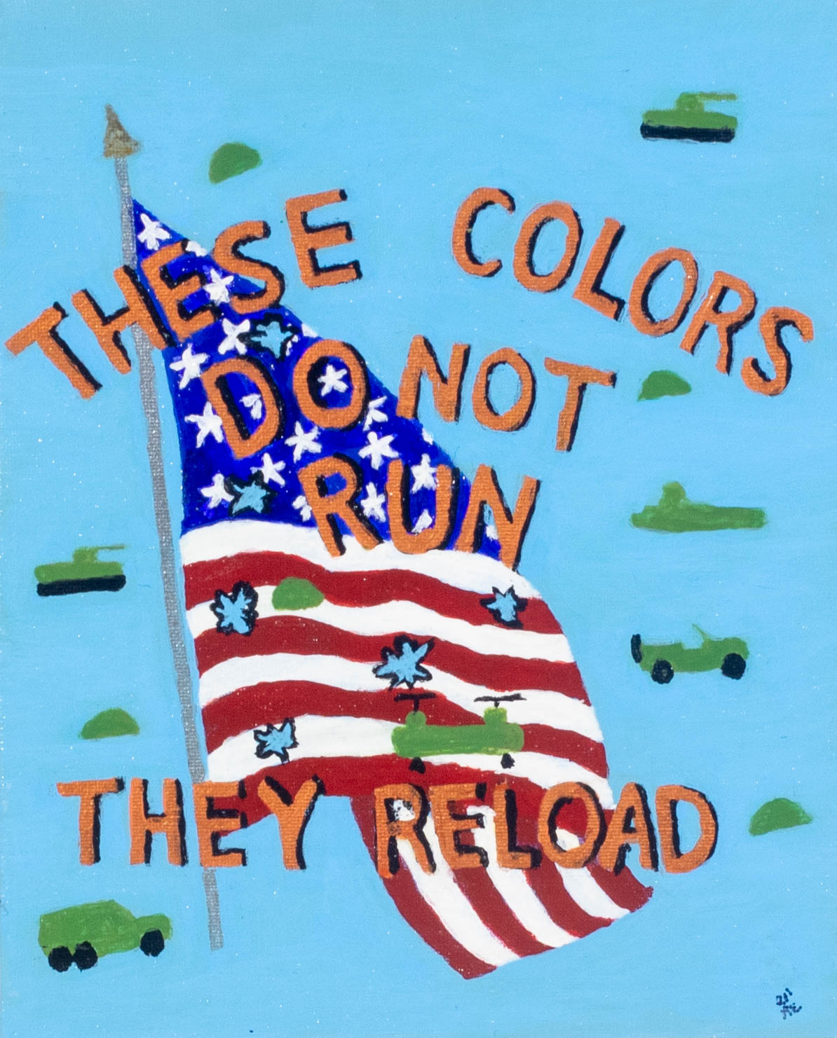 - A painting of a large United States flag, blowing to the right. In the bright blue background there are small green military vehicles. There is a series of large orange block text that reads, " These colors do not run, they reload."