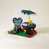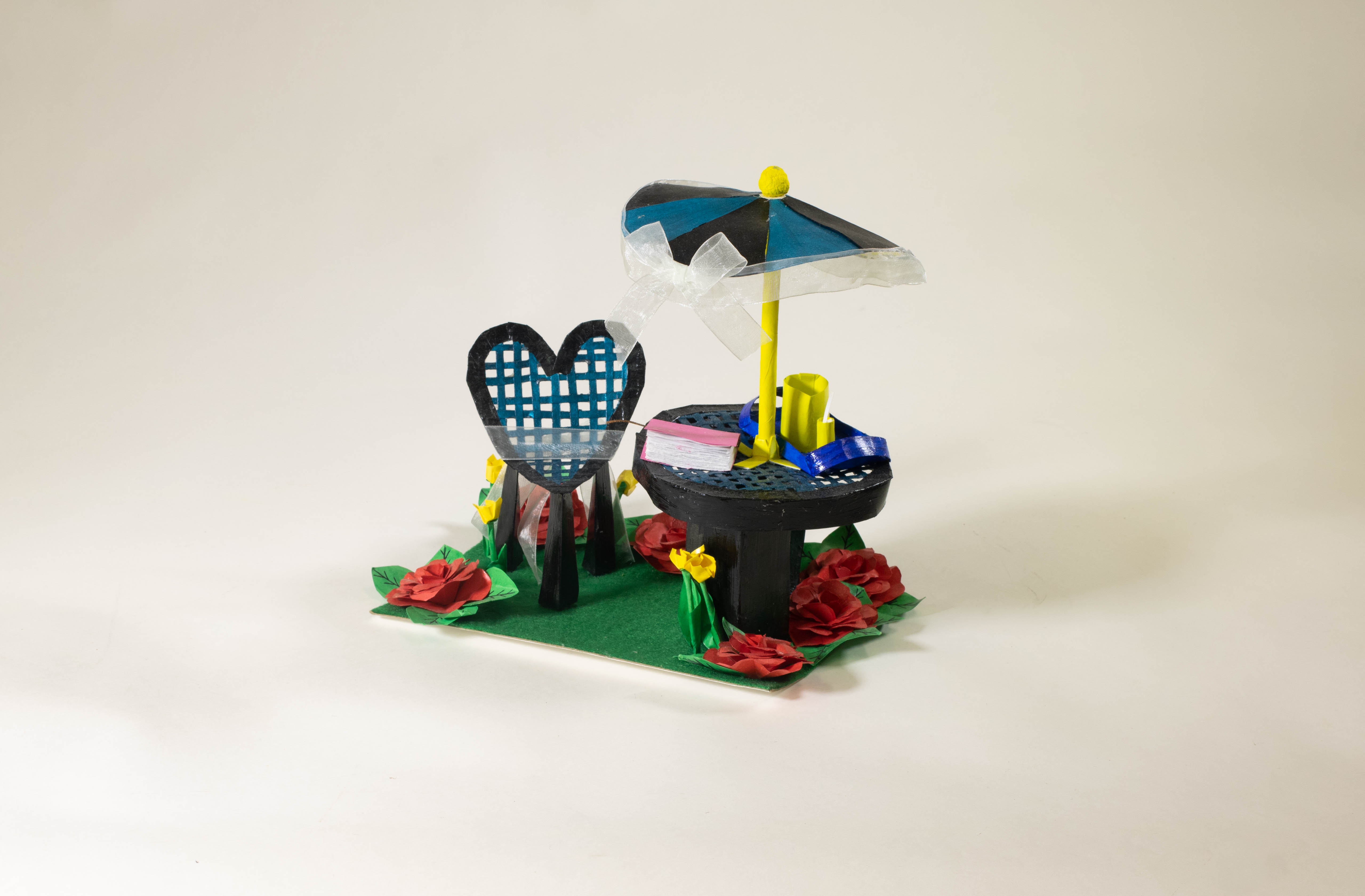 - A small sculpture of a garden scene: green grass red roses, and a black and lbue picnic table and heart shaped chair. The table has an umbrella and a yellow pitcher.