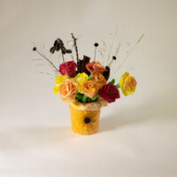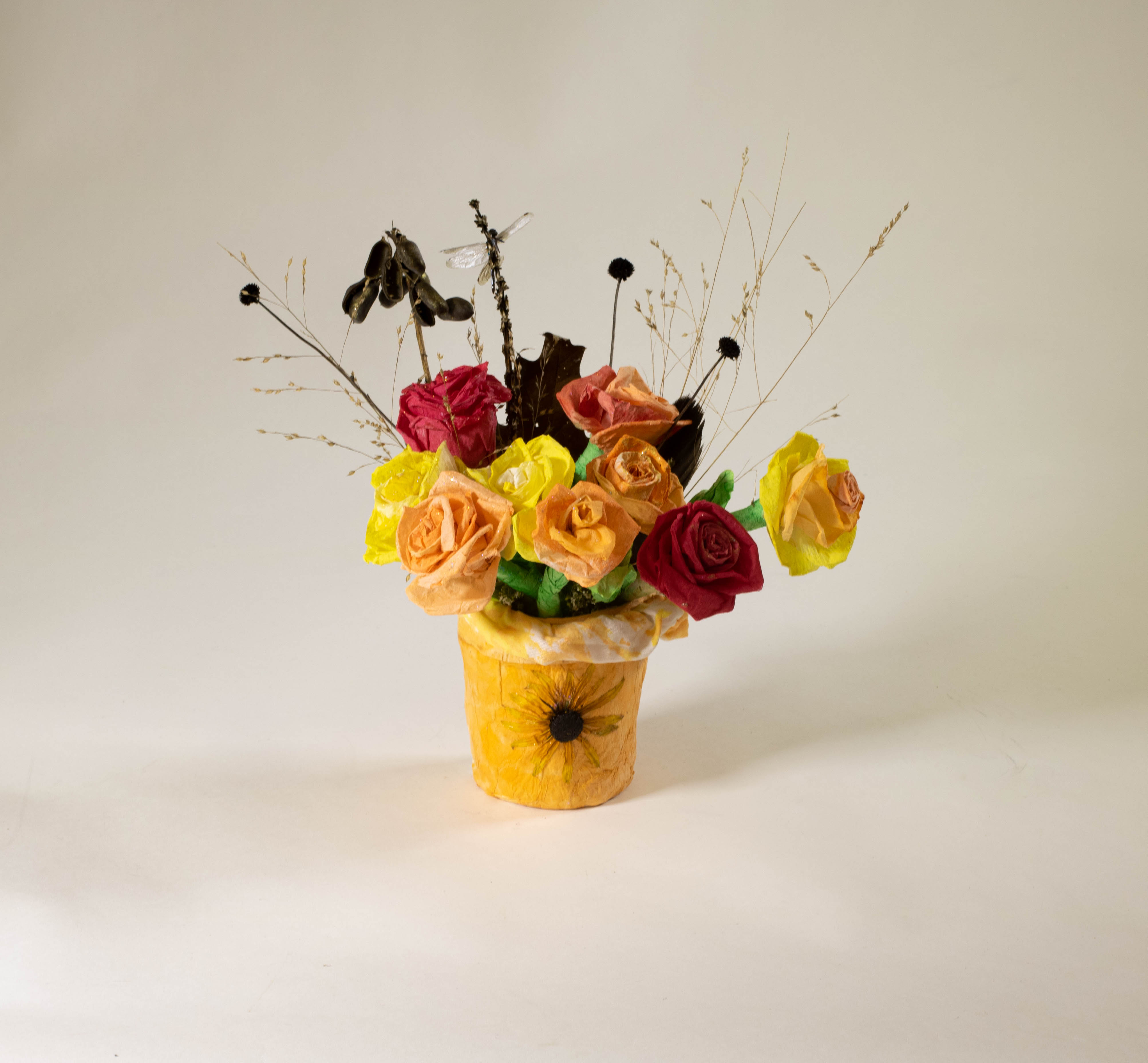 - A handmade boquet of roses: red, yellow, and orange, gathered in a yellow pot. The pot has a single dried yellow flower on the outside. There are tall brown grasses that compliment the roses in the vase.