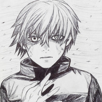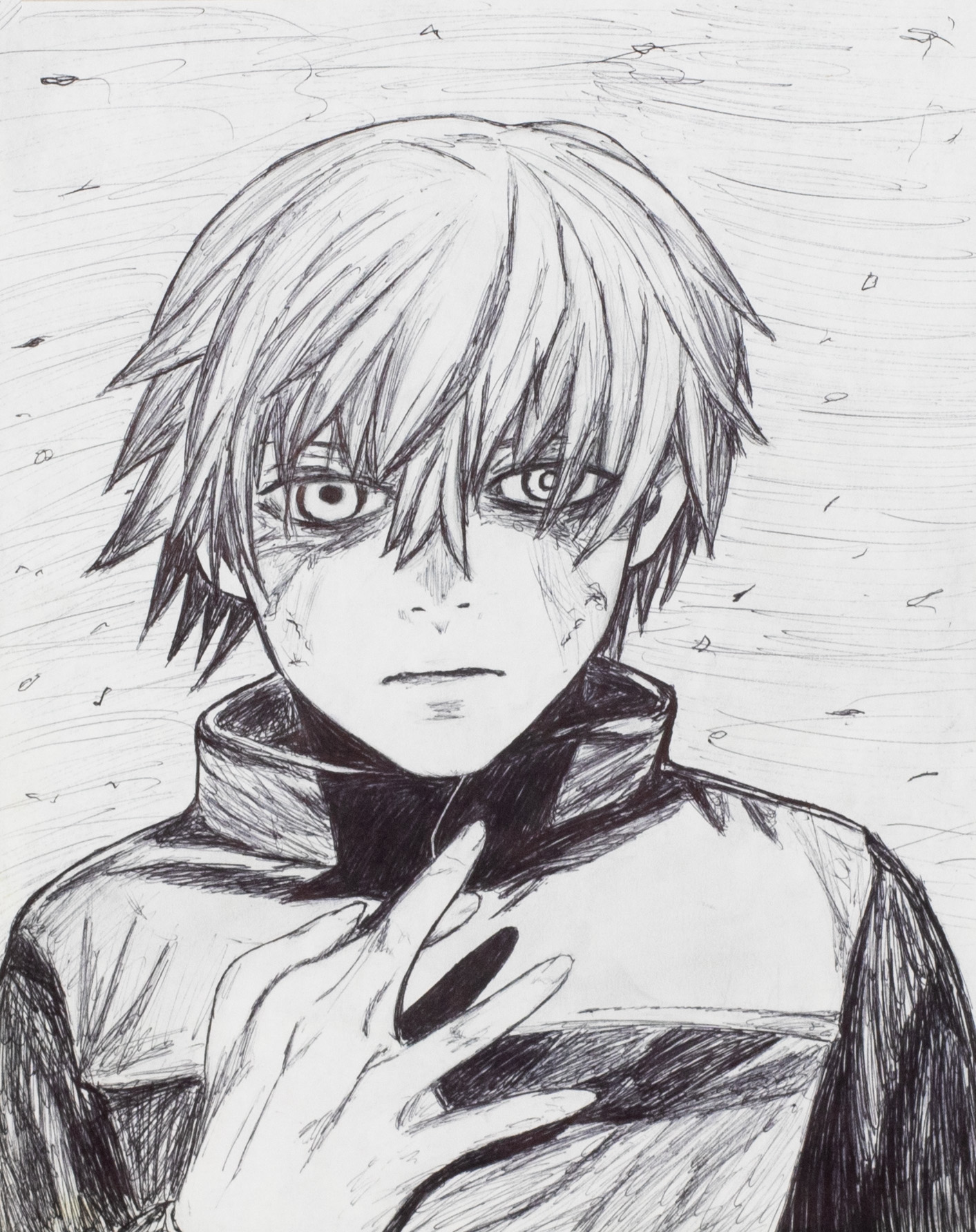 - An anime drawing of a youngman with medium length hair and spiral eyes, he has one hand rasied up to his chest. There are petals blowing in the background behind him. It is a character from an anime series called Tokyo Ghoul.