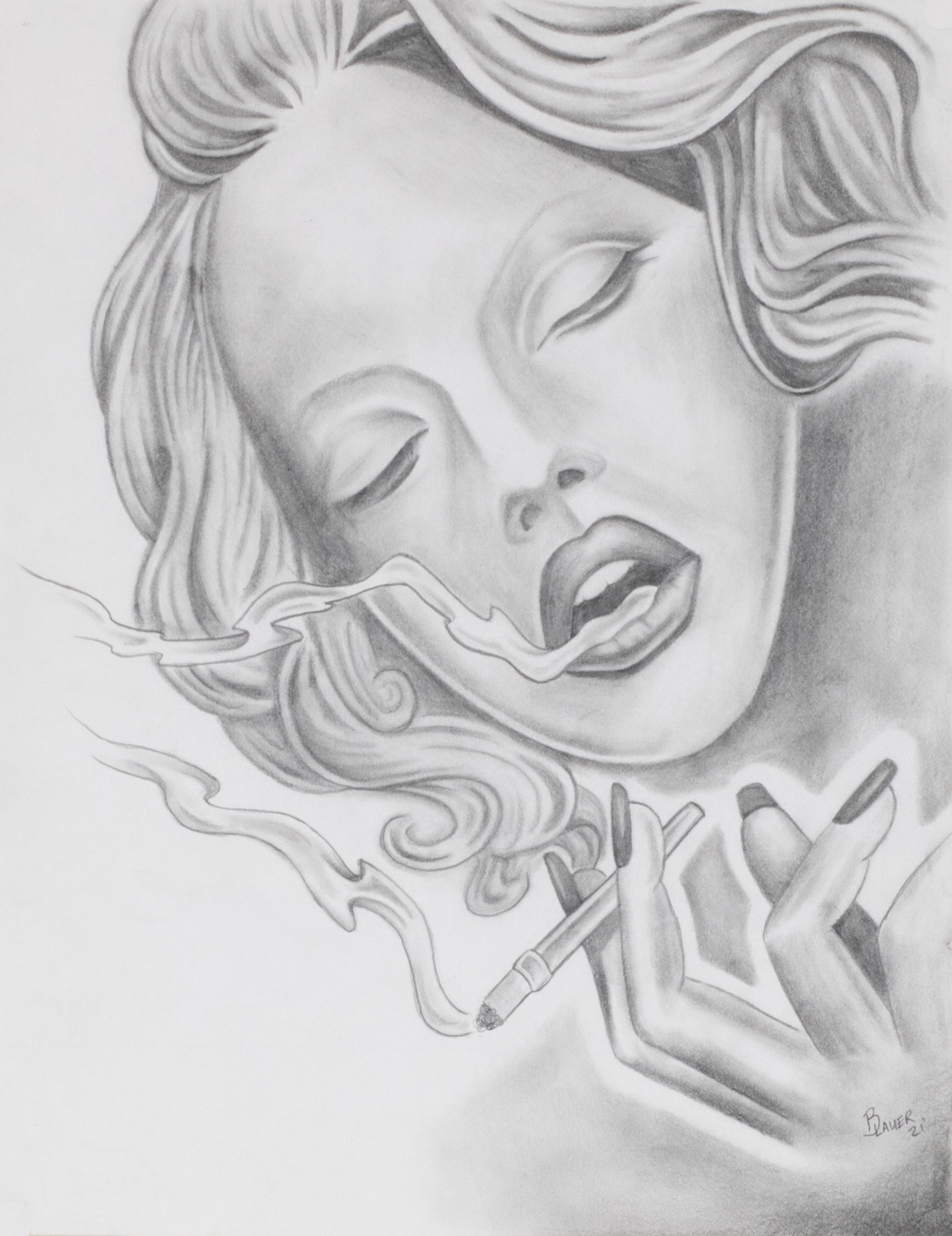 - A close up drawing of a white woman's face, she is holding a cigarette in her manicured hand, and smoke is escaping from her red lips. Her eyes are closed, and she has waby short hair.