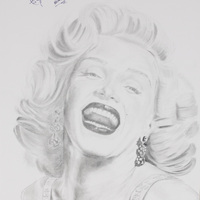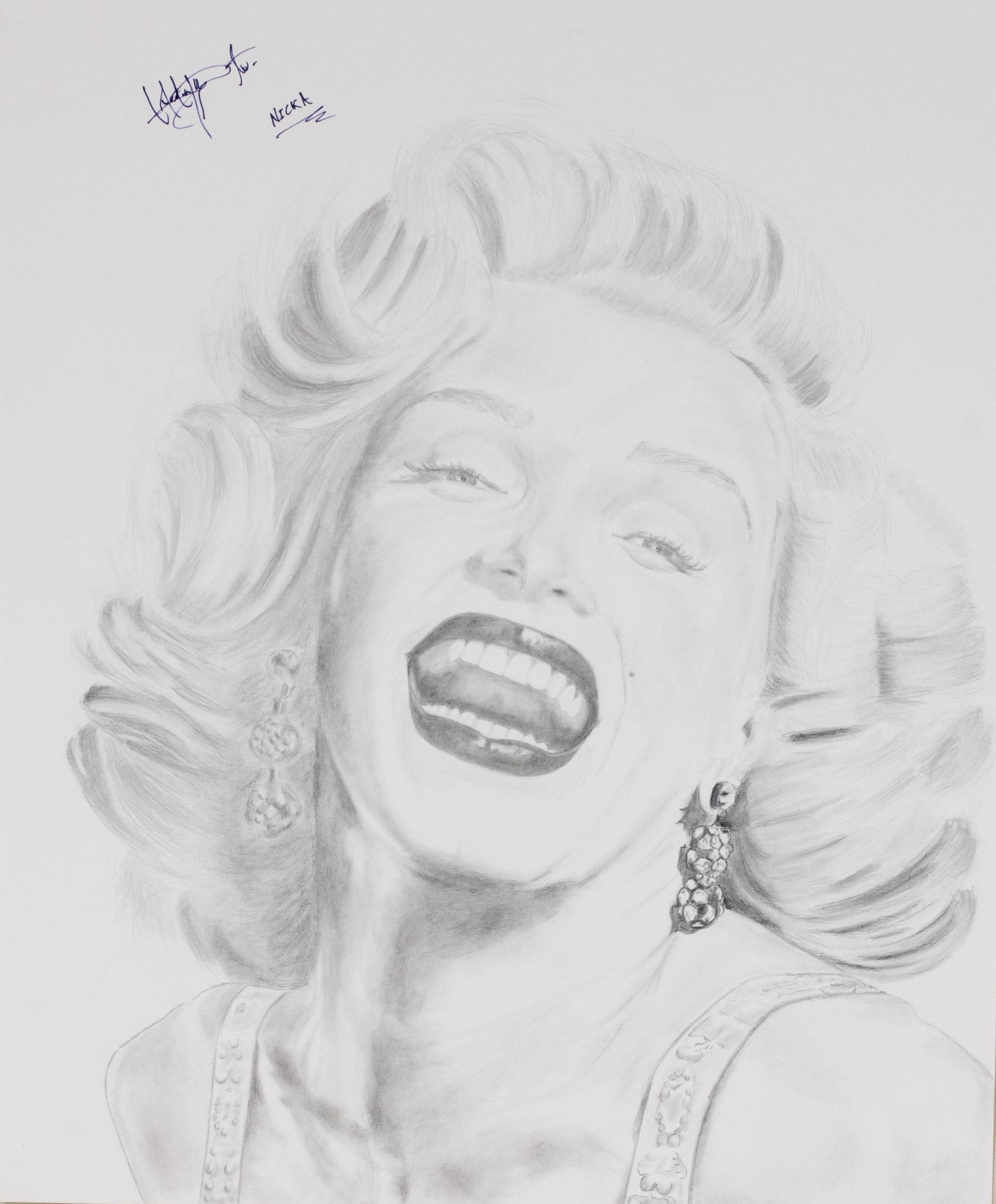 - A pencil drawn portrait of Marilyn Monroe, she has curly short hair, dangly earrings, and bright red lipstick. She is laughing.