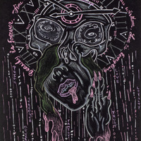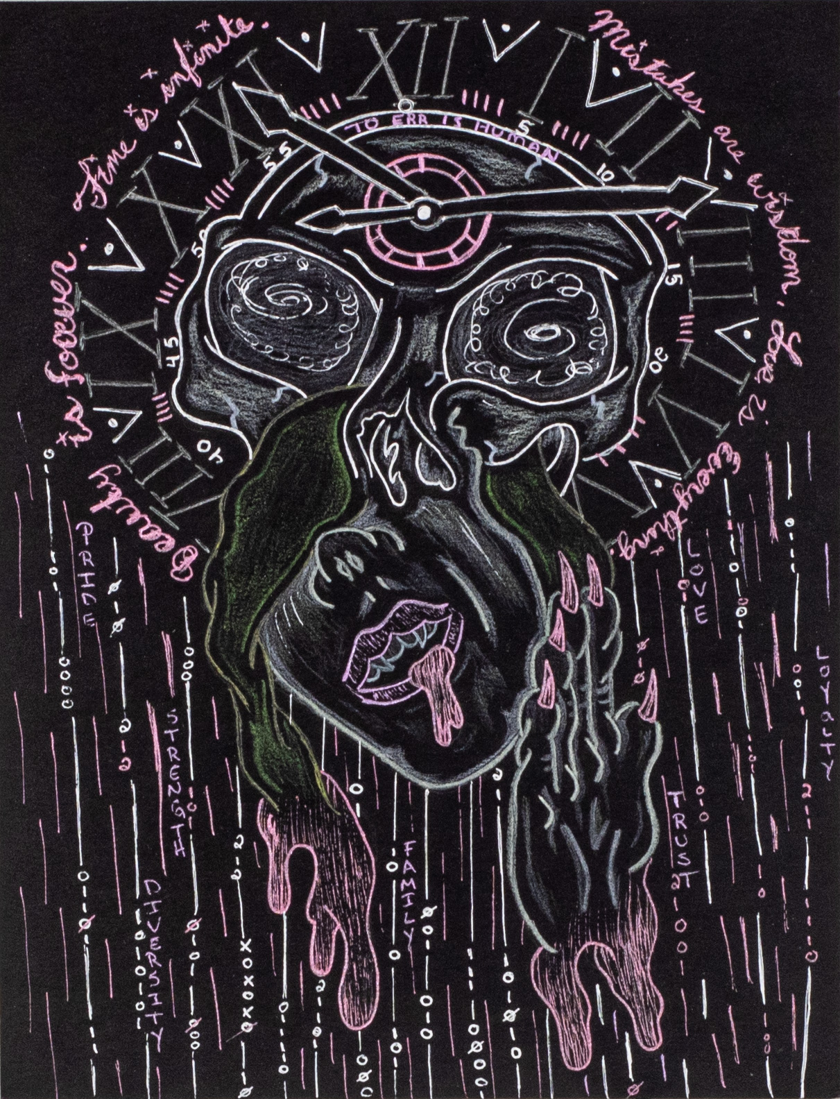 - a drawing over a black page, of an abstracted face that has a clock forehead amd swirly eyes, and open mouth with pink lips. There are chunks of flesh falling off and dripping pink. Around the clock are roman numerals and phrases that flow to the bottom of the page in short lines. They say words like, "Trust, price, family, loyalty, love," and more.
