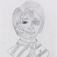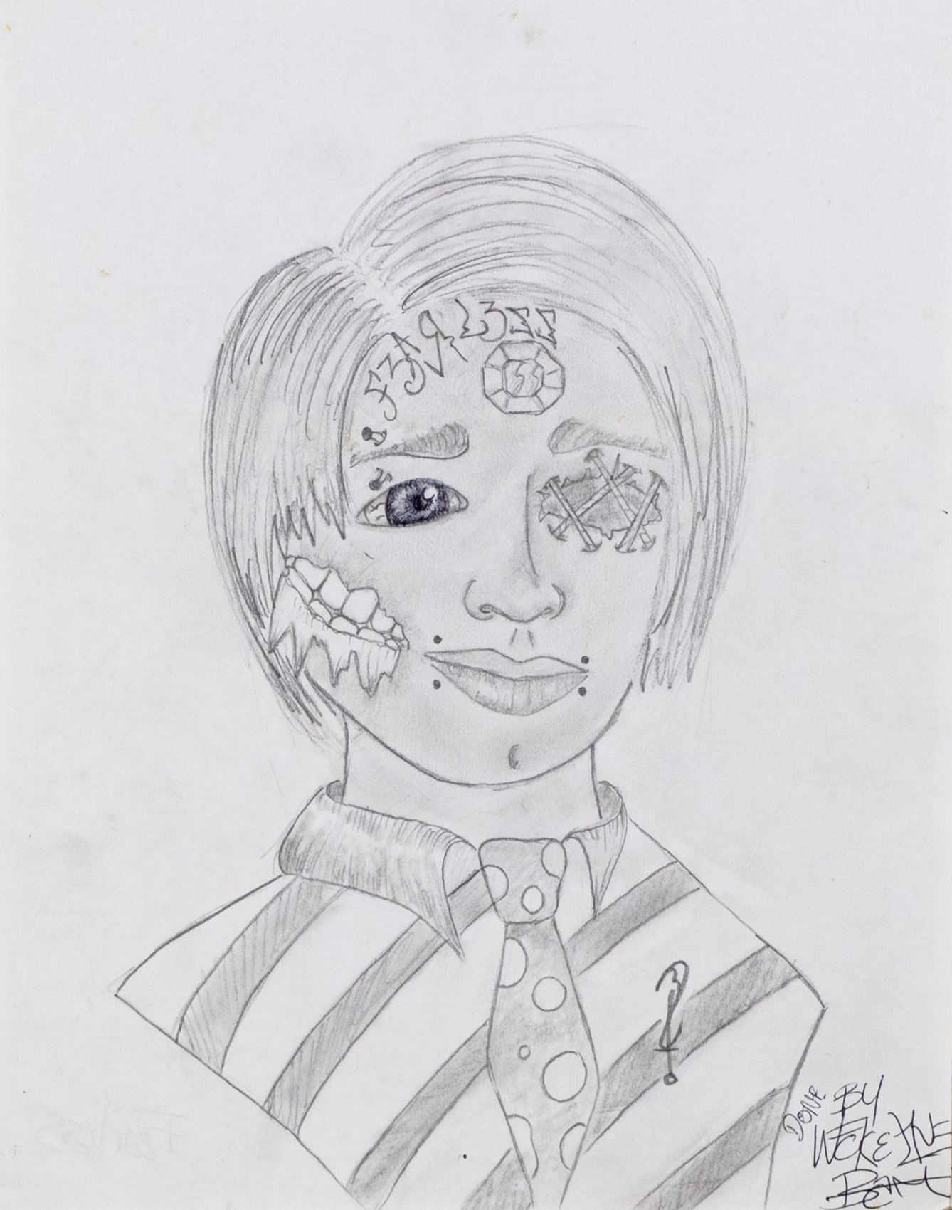 - a pencil drawing of a person from the shoulders up, they are wearing a striped button shirt and polka dot tie. They have straight sewpt over hair, and four lip piercings. Their face has a series of malformations: a hole in a cheek exposing teeth, and an empty eye socket sewn shut with four large stitches. There are also nails in the eyebrow, and a device in the center of the forehead