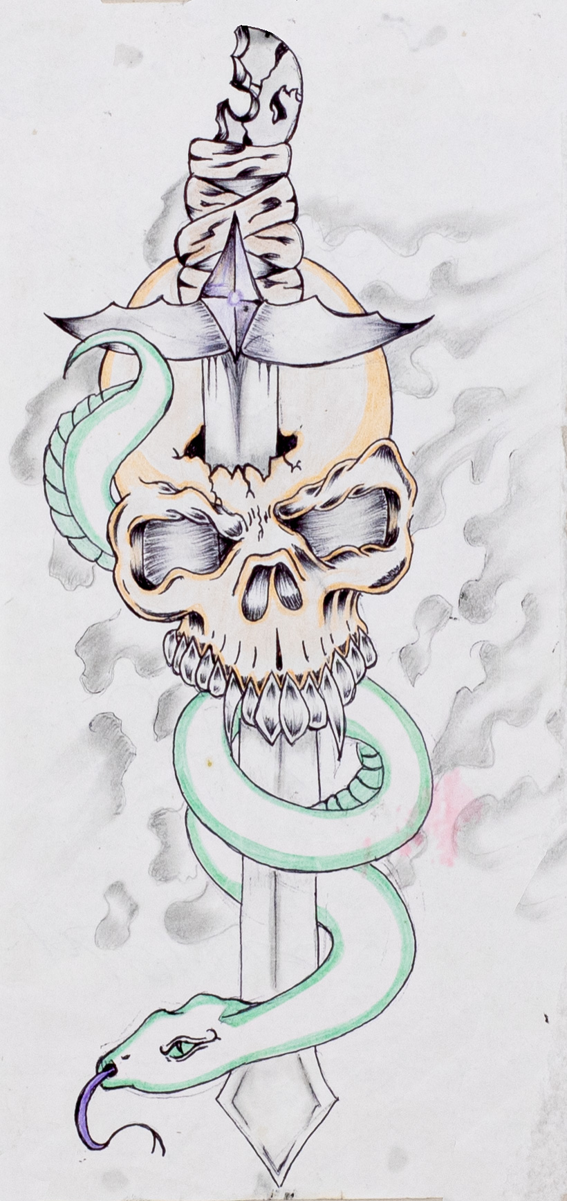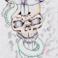 - a drawing of an old weathered sword piercing the cranium of a yellow skull. There is a large green snake wrapped around the sword.
