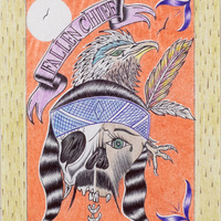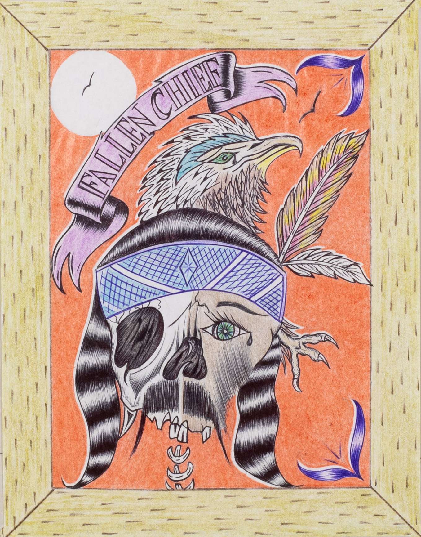 - a drawing of a half flesh, half skelton ,face. The man has long dark hair and a blue bandana with two feathers on his head. There is the head of an eagle above his head, and a purple banner that says, "fallen chief." The background is an orange color, and a bright white moon is in the left corner.
