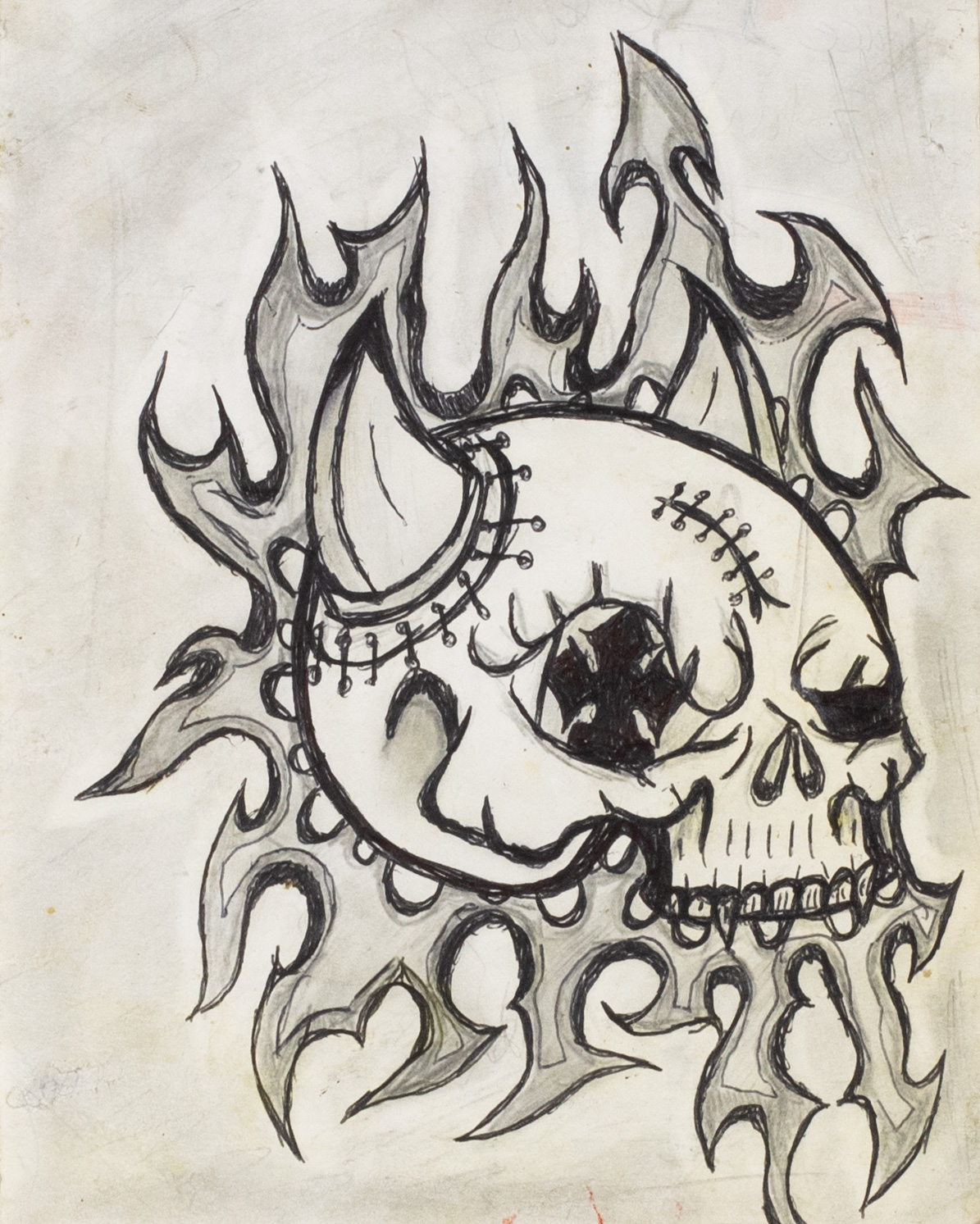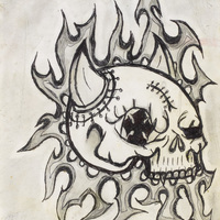 - a ink line drawing of a skull surrounded by flames, there are stitches on the skull, and two short sharp horns