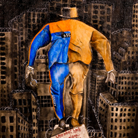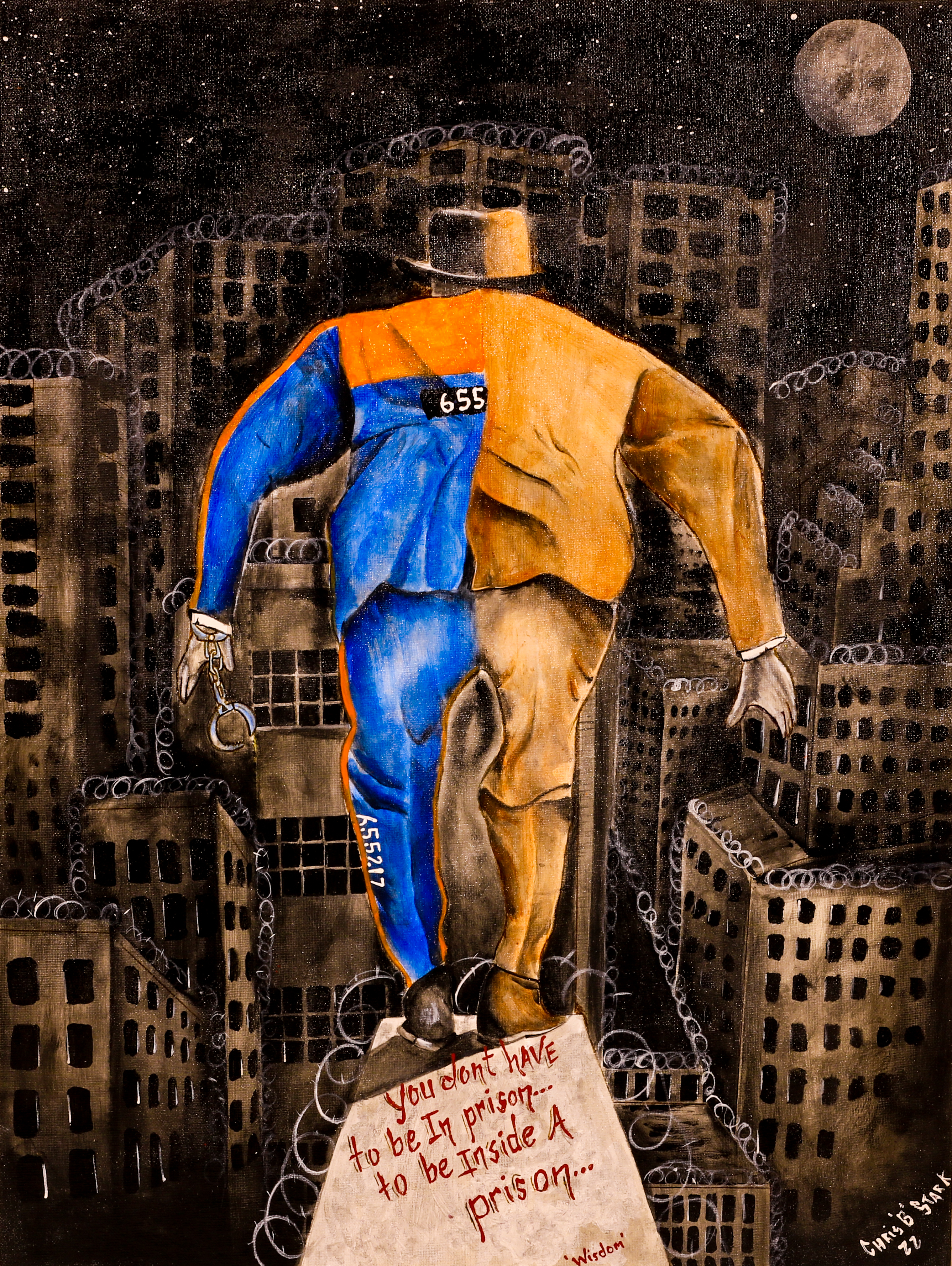 - A man in half prison clothes and half a suit standing on top of a building at night looking over the tops of other buildings. The moon is in the top right corner. There is text that reads "You don't have to be In prison to be Inside A prison..." on the building the man is standing on top of.