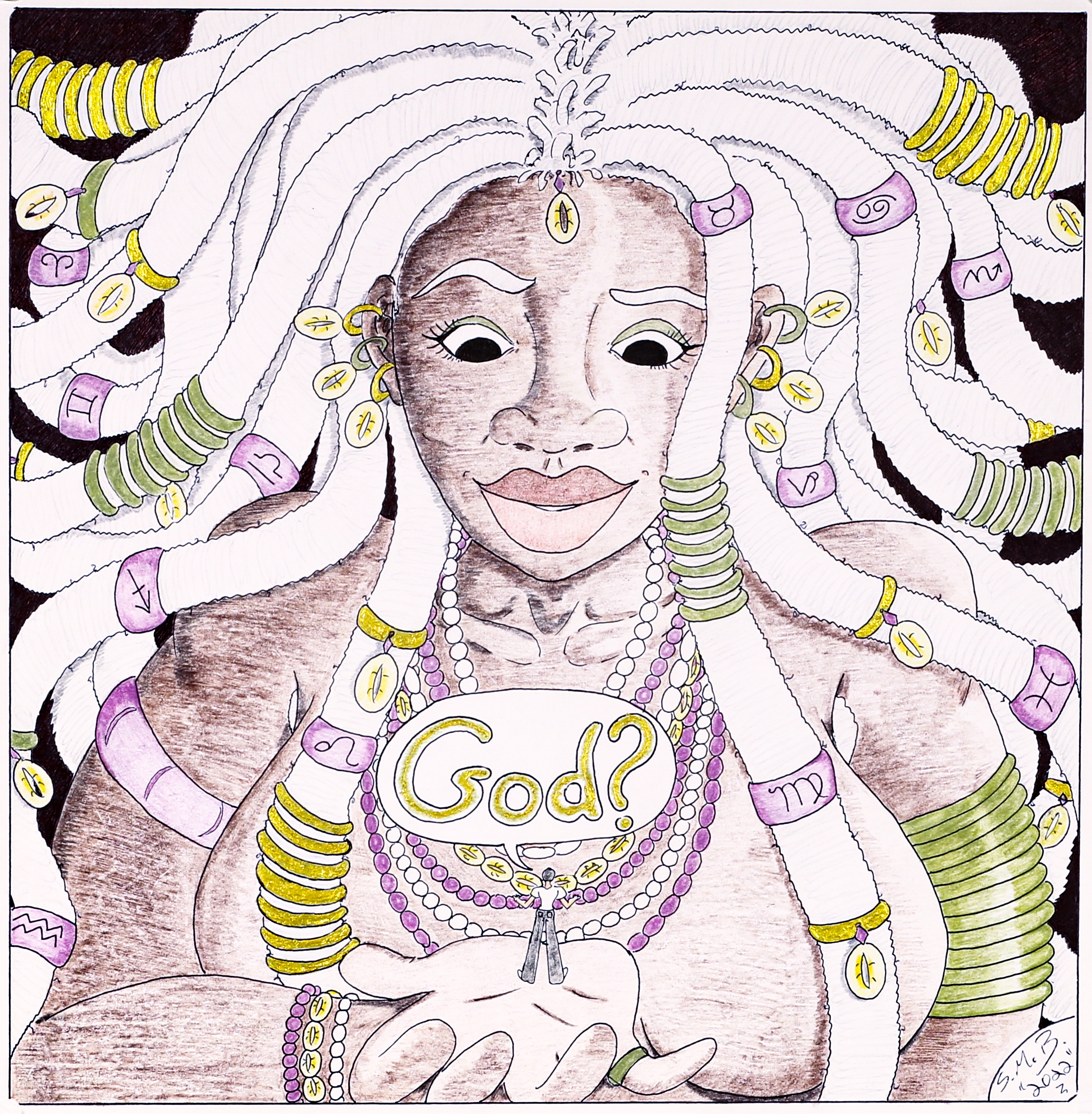 - A drawing of an African woman with purple and gold jewelery holding a small person in her palm. Some strands of her hair has jewelery with each zodiac symbol.