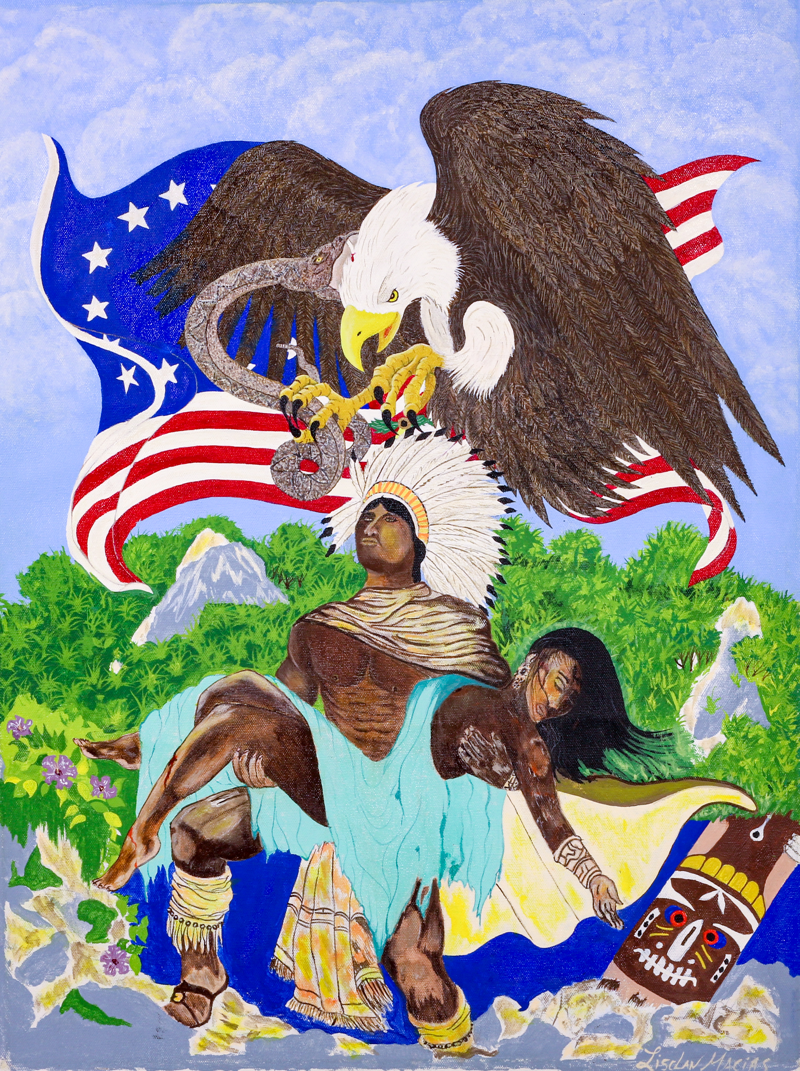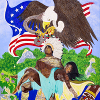- A man in a Native American headress carrying a woman. There is a bald eagle and snake flying down with an American flag in the background.