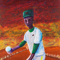 - A baseball player in a white and green uniform with a background of reds and yellows.
