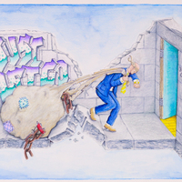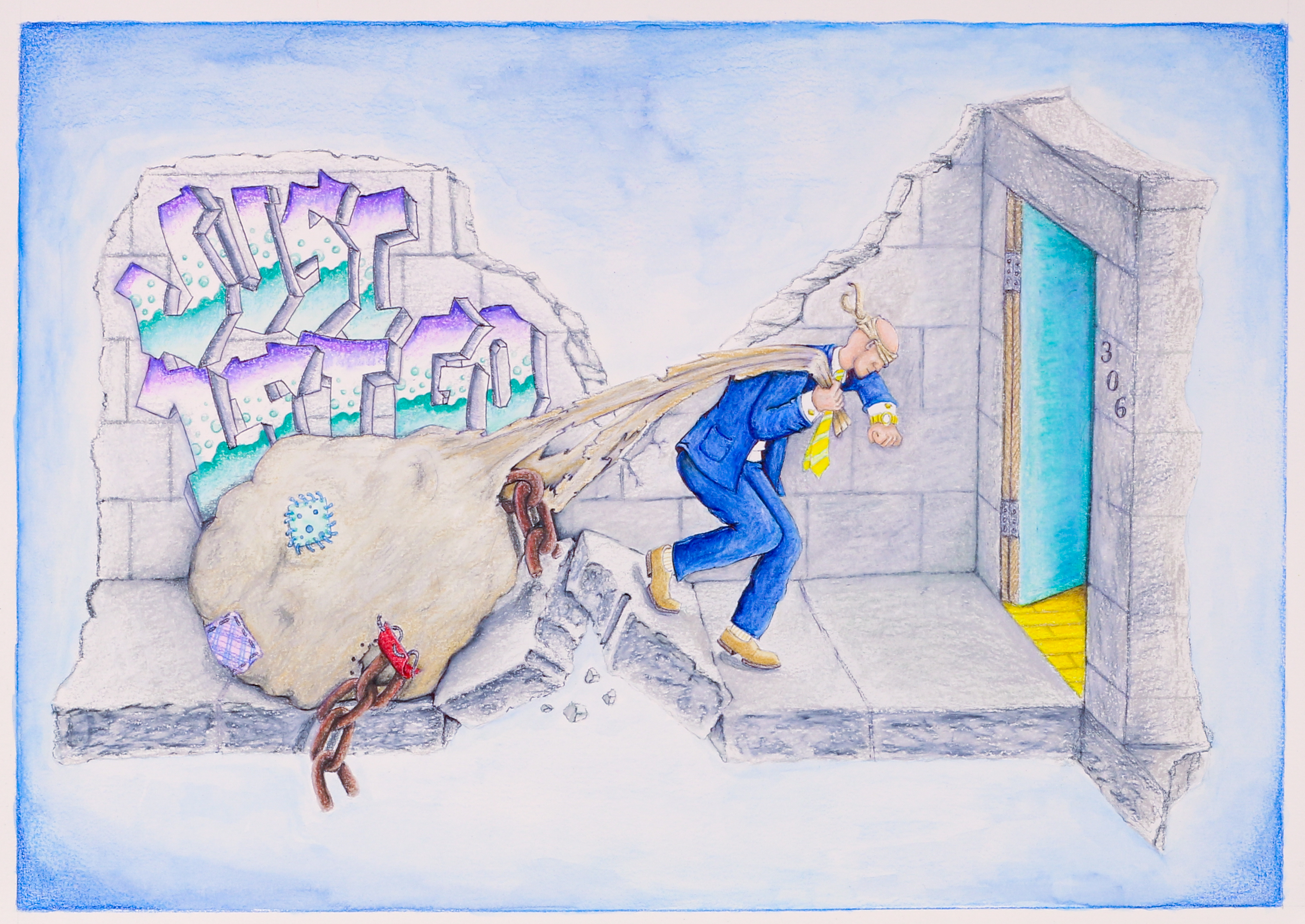 - A blindfolded man in a blue suit carrying a heavy sack behind him and walking toward an open door. There are chains falling out of the sack and the wall is broken behind him.