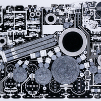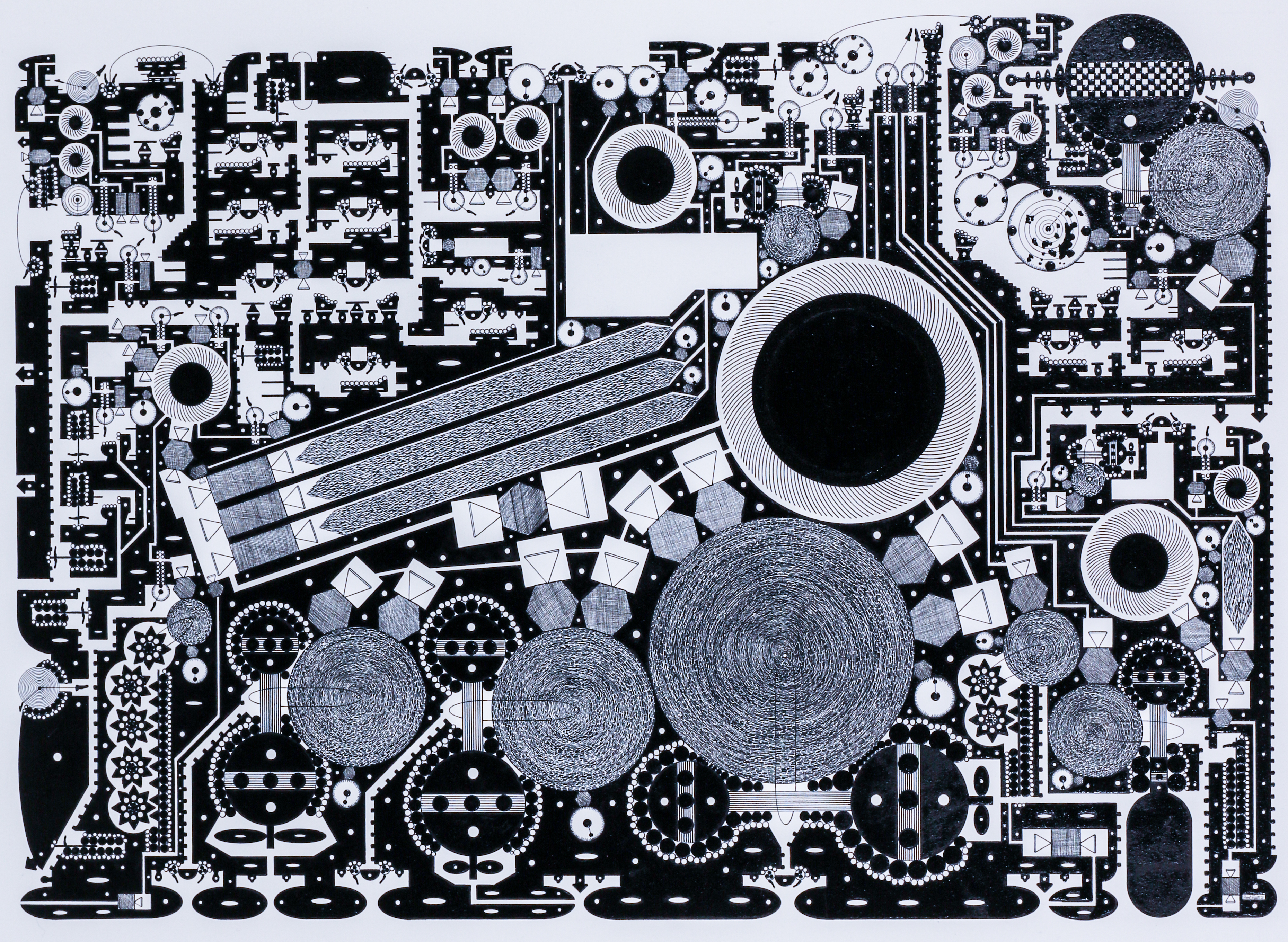 - An black and white abstract geometric piece with shapes such as circles, triangles, and squares