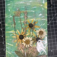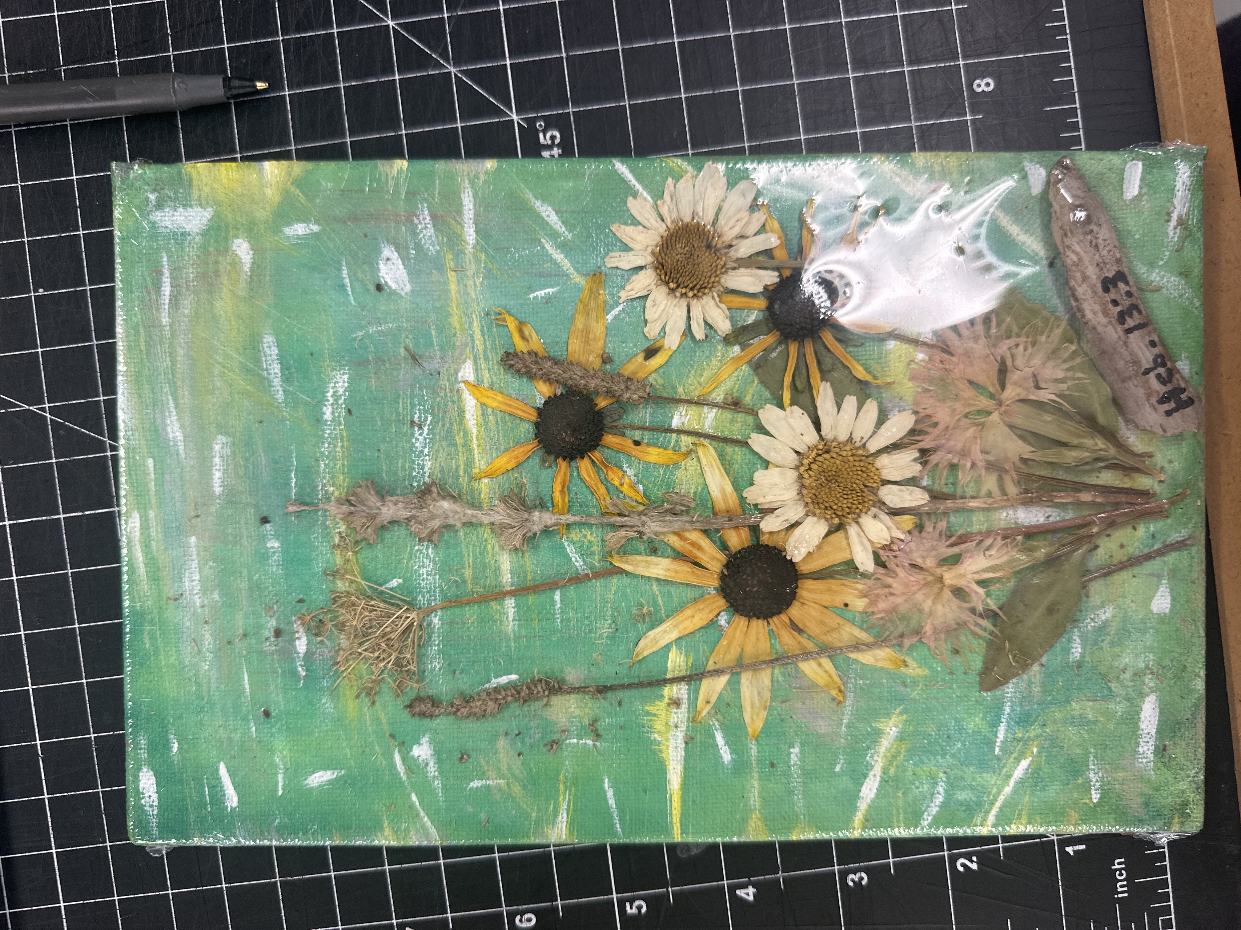 - several dried flowers on a green background with a small stick with 'Heb. 13-3'