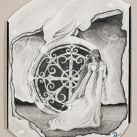 - Woman with long hair and flowy dress standing in front of a round fantasy door