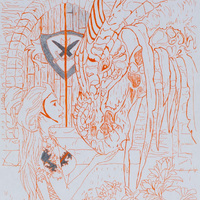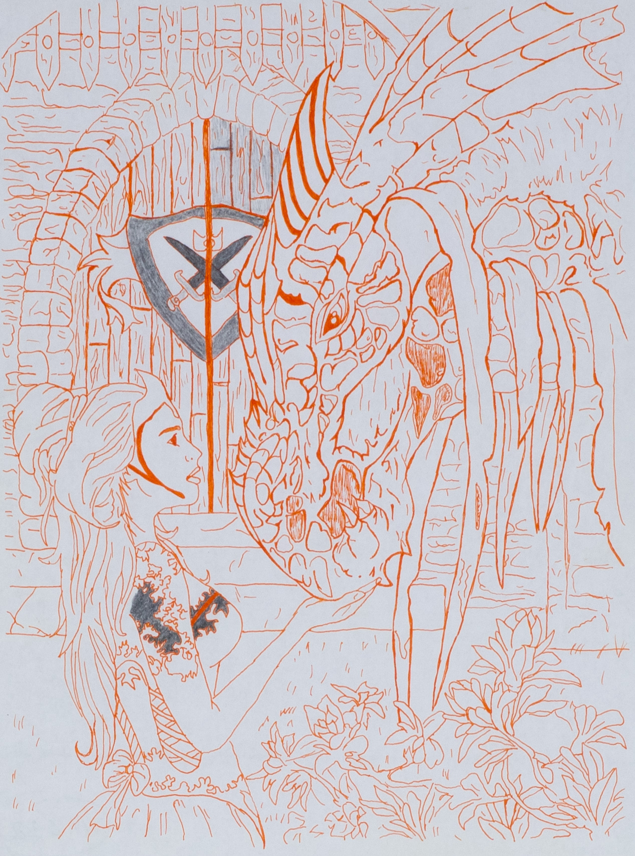 - Orange pen drawing of a woman petting a dragon in front of a mideaval style castle door