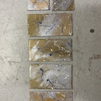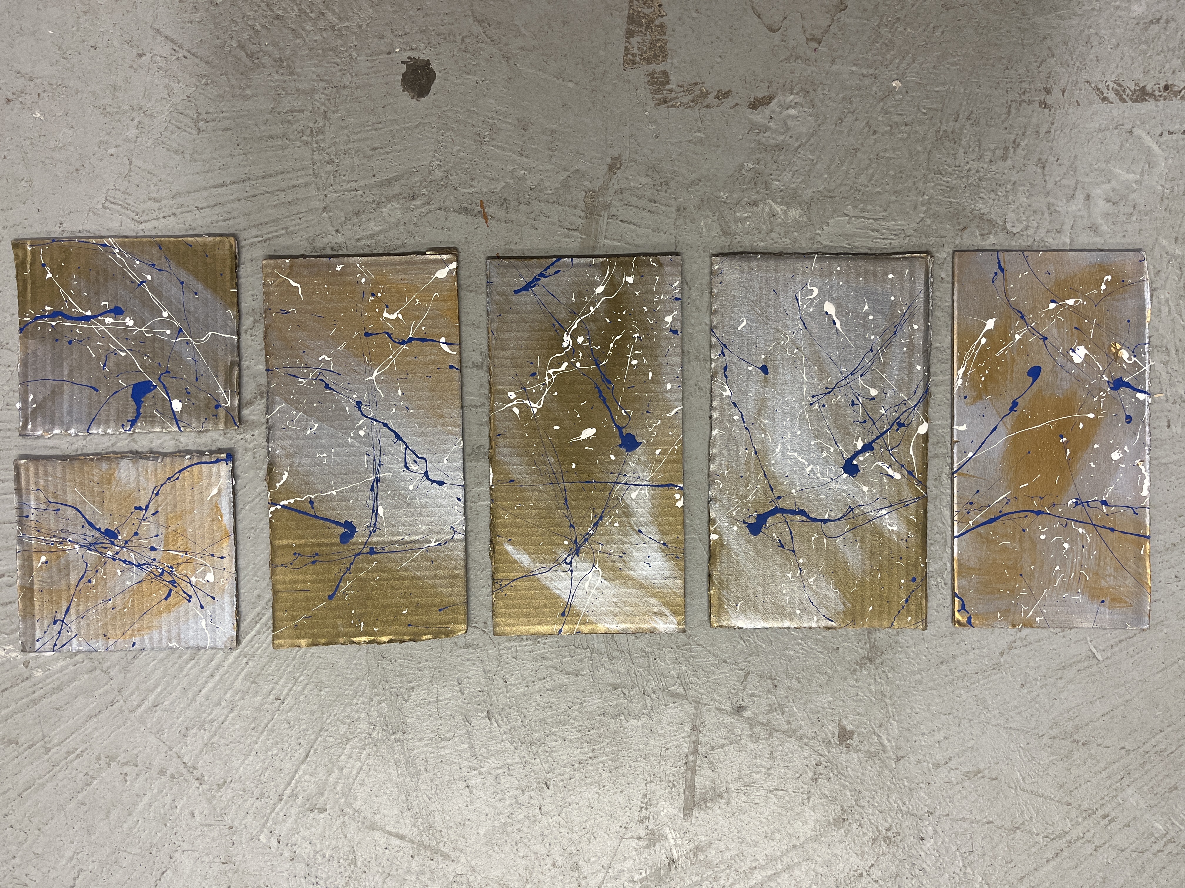 - abstract blue splatter and white smudges on 6 panels of gold painted cardboard.