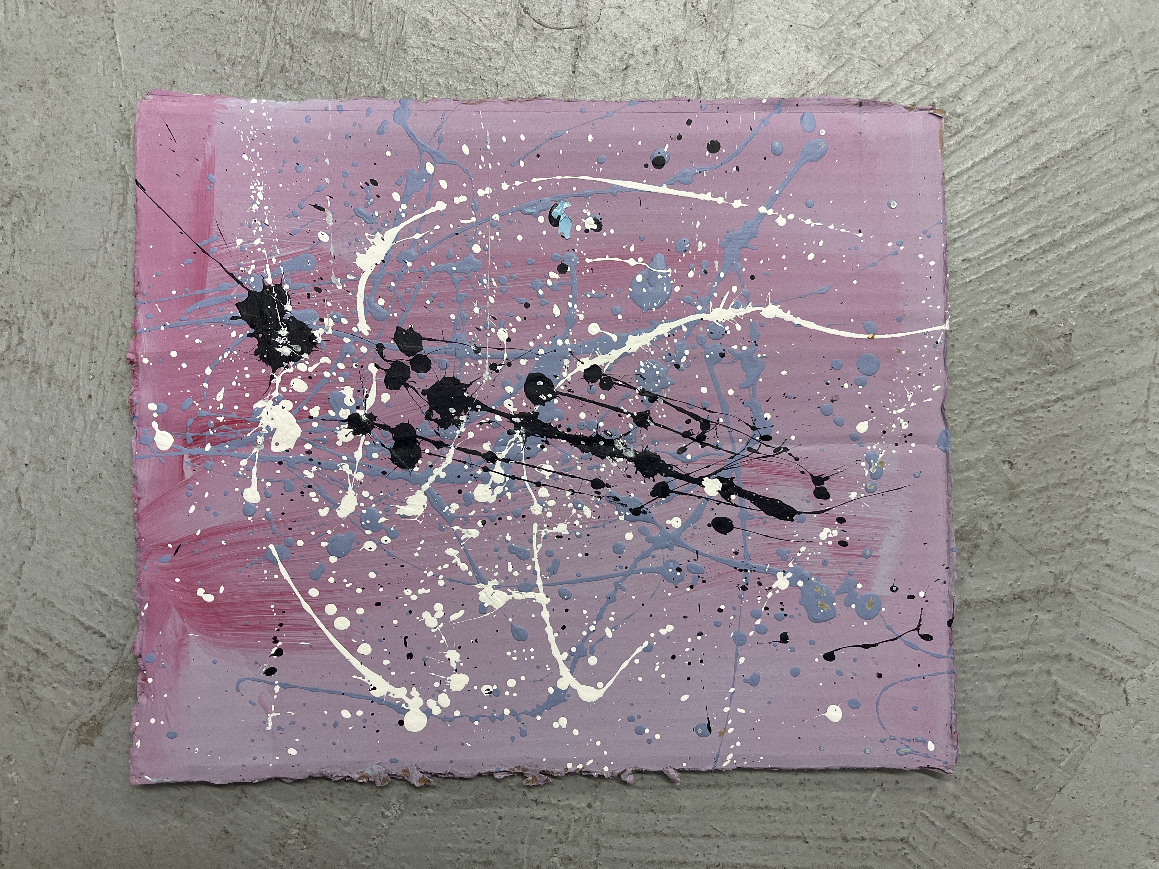- abstract black, white, and blue splatter on light pink background