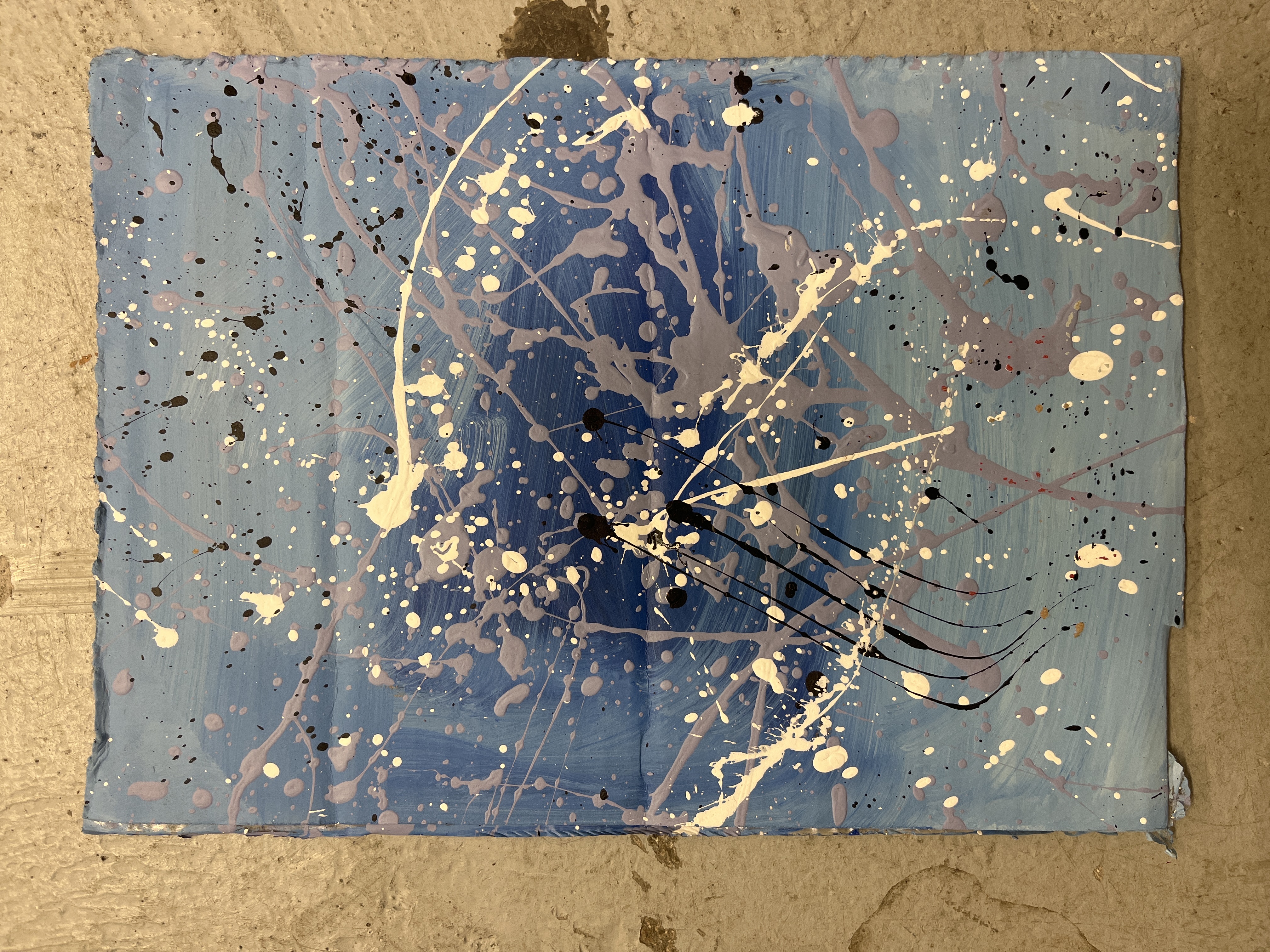 - abstract grey, white, and black splatter on light blue background with dark blue spot in the center