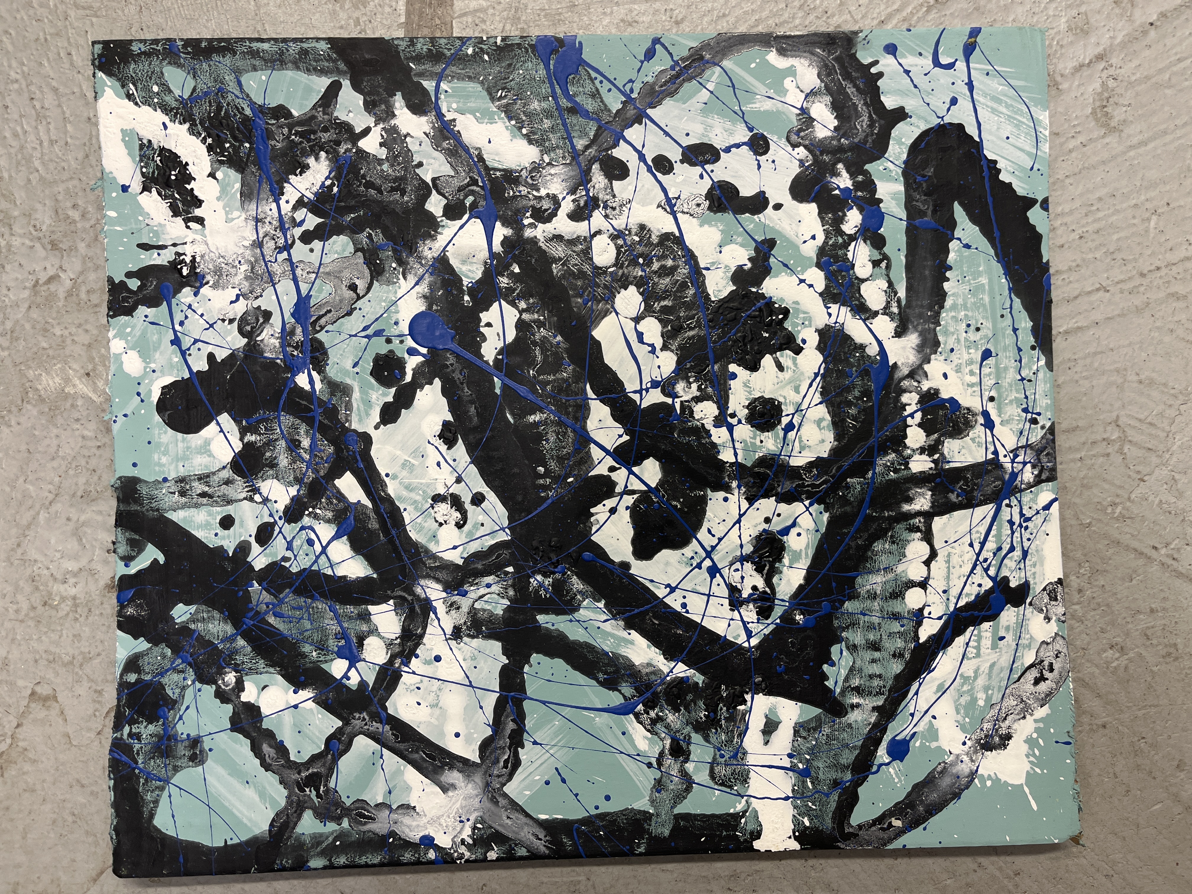 - abstract blue splatter over black and white splotchy lines on a teal background